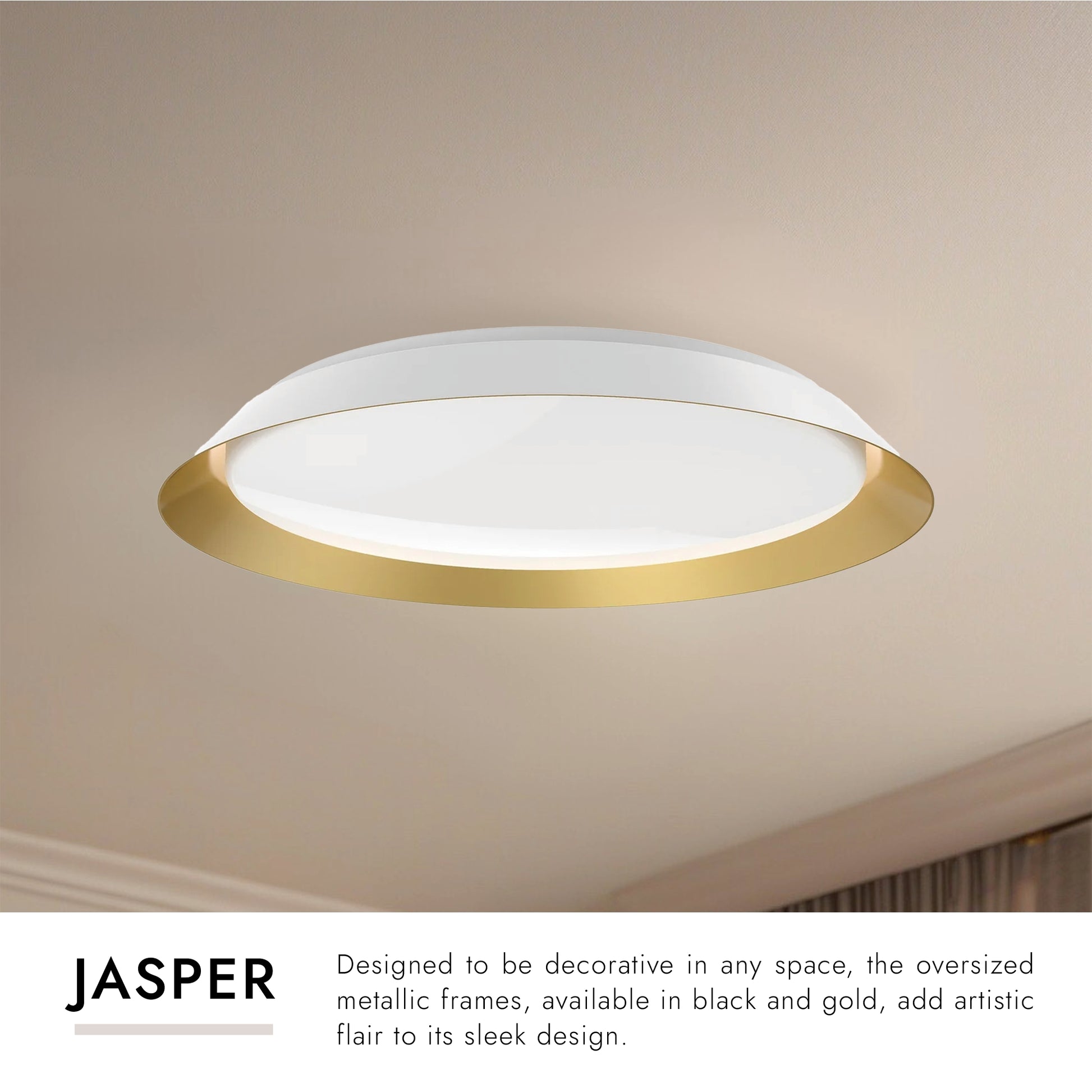 Designed to be decorative in any space, the oversized metallic frames, available in black and gold, add artistic flair to its sleek design.