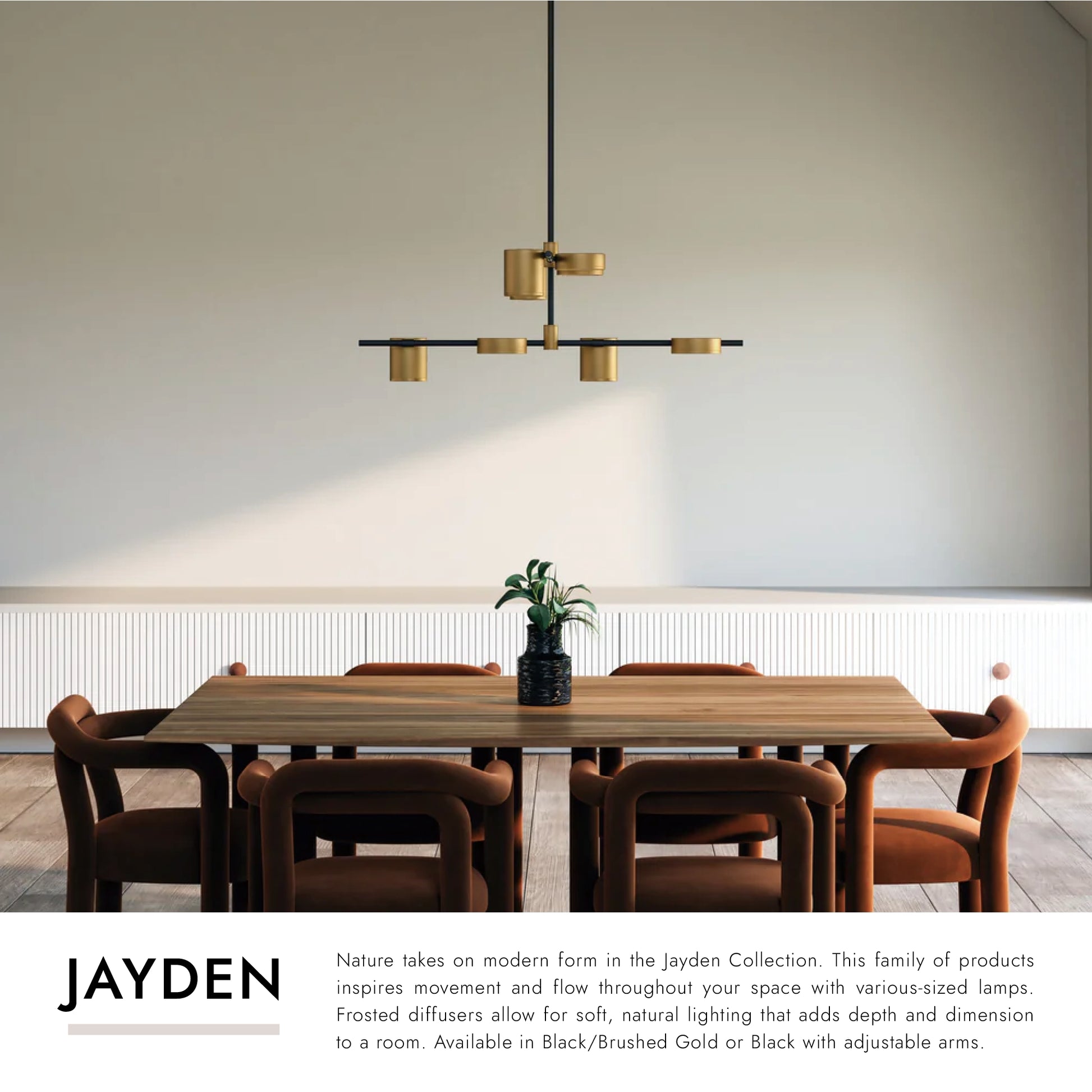 Nature takes on modern form in the Jayden Collection. This family of products inspires movement and flow throughout your space with various-sized lamps. Frosted diffusers allow for soft, natural lighting that adds depth and dimension to a room. Available in Black/Brushed Gold or Black with adjustable arms.