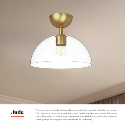 The culmination of simple shapes and unexpected details make the Jude collection unique. With geometric stems and organically curved details, the Jude adds artistic flair to any space. This collection of delicately forged metal is topped with a classic half-dome glass shade, giving it an hourglass-like silhouette fit for the runway.