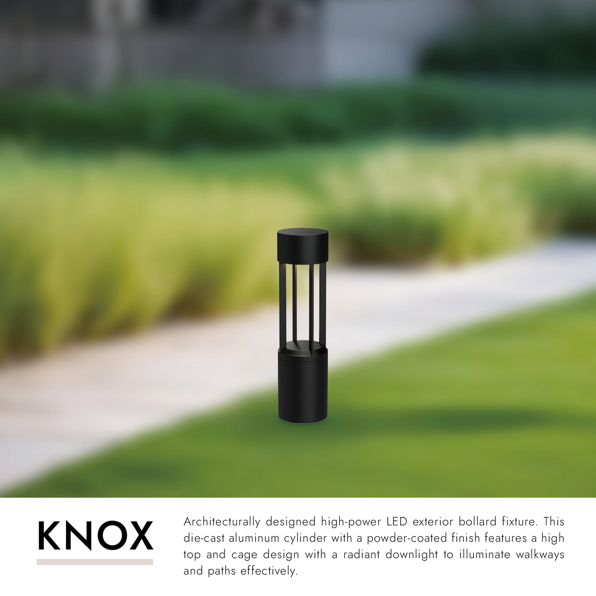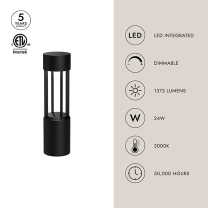 Architecturally designed high-power LED exterior bollard fixture. This die-cast aluminum cylinder with a powder-coated finish features a high top and cage design with a radiant downlight to illuminate walkways and paths effectively
