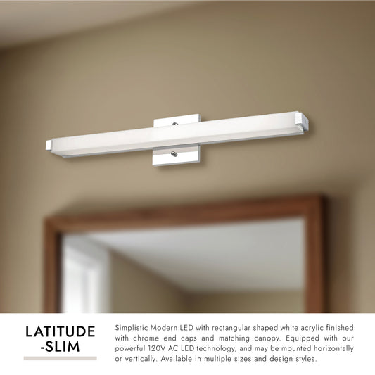 Simplistic Modern LED with rectangular shaped white acrylic finished with chrome end caps and matching canopy. Equipped with our powerful 120V AC LED technology, and may be mounted horizontally or vertically. Available in multiple sizes and design styles.