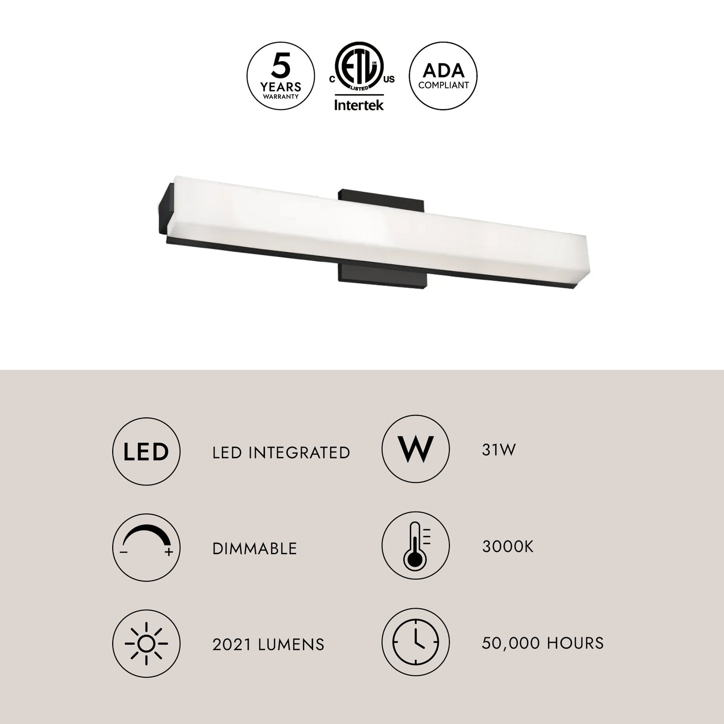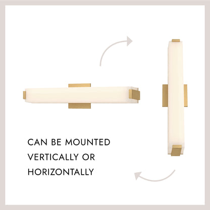 An extruded rectangular diffuser surrounds the LED source of the geometric vanity fixture. Capped by two thick offset squares the design is characterized by minimal details and clever features. During installation the lamp assembly may slide on the mounting track to allow for ideal positioning. Adding to the versatile function are the multiple fixture lengths and mounting orientations. Optional installation without backplate for smaller junction boxes.