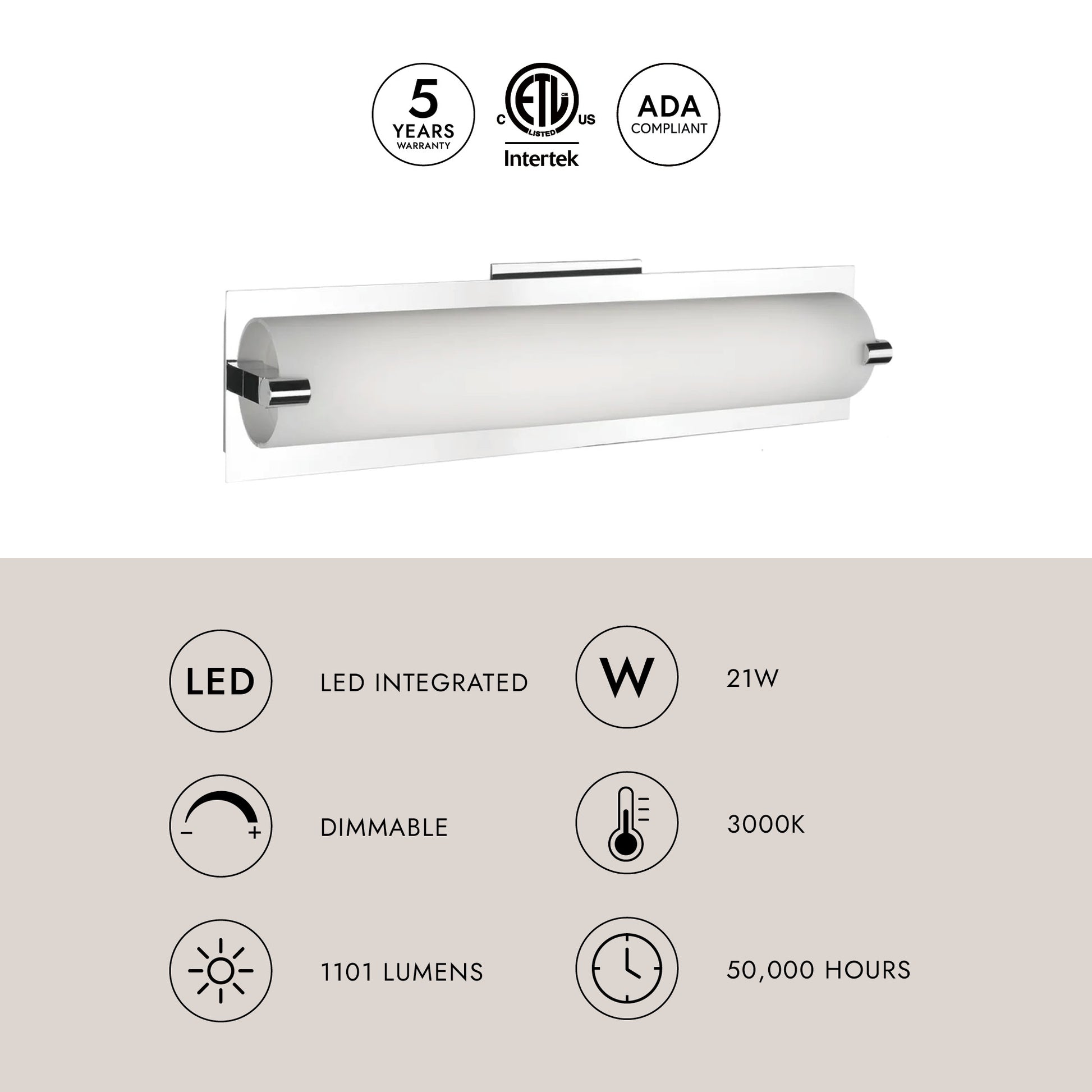 Single lamp vanity with white opal glass cylinder and frosted side covers, metal details available in black, brushed gold, brushed nickel or chrome finish. Equipped with our powerful 120V AC LED technology. Available in three different sizes see series for full details.