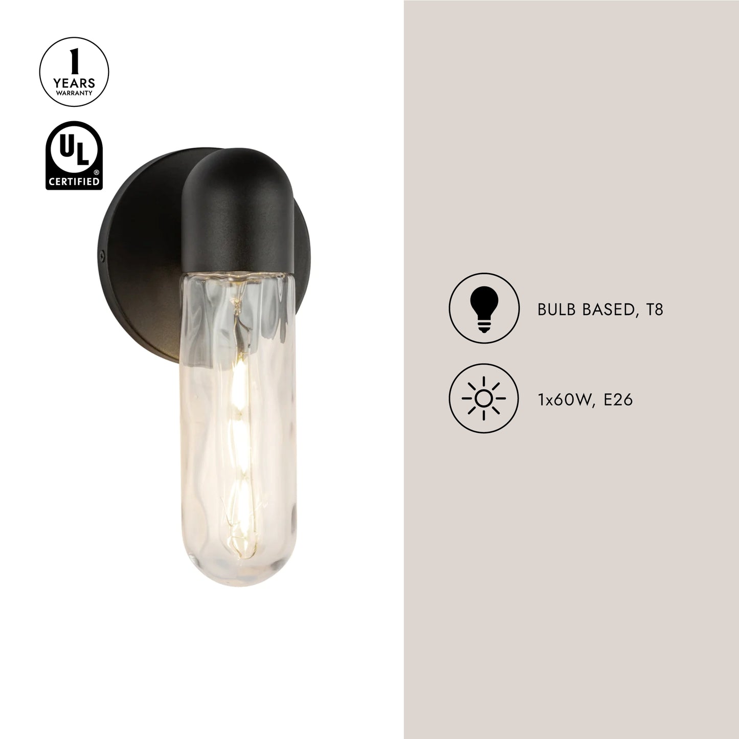 Discover modern sophistication with our simple yet striking pill-shaped Lima outdoor wall sconce. Crafted in matte black with water glass accents, this fixture seamlessly complements a contemporary exterior. The Lima bathes your outdoor space in warm, inviting illumination.