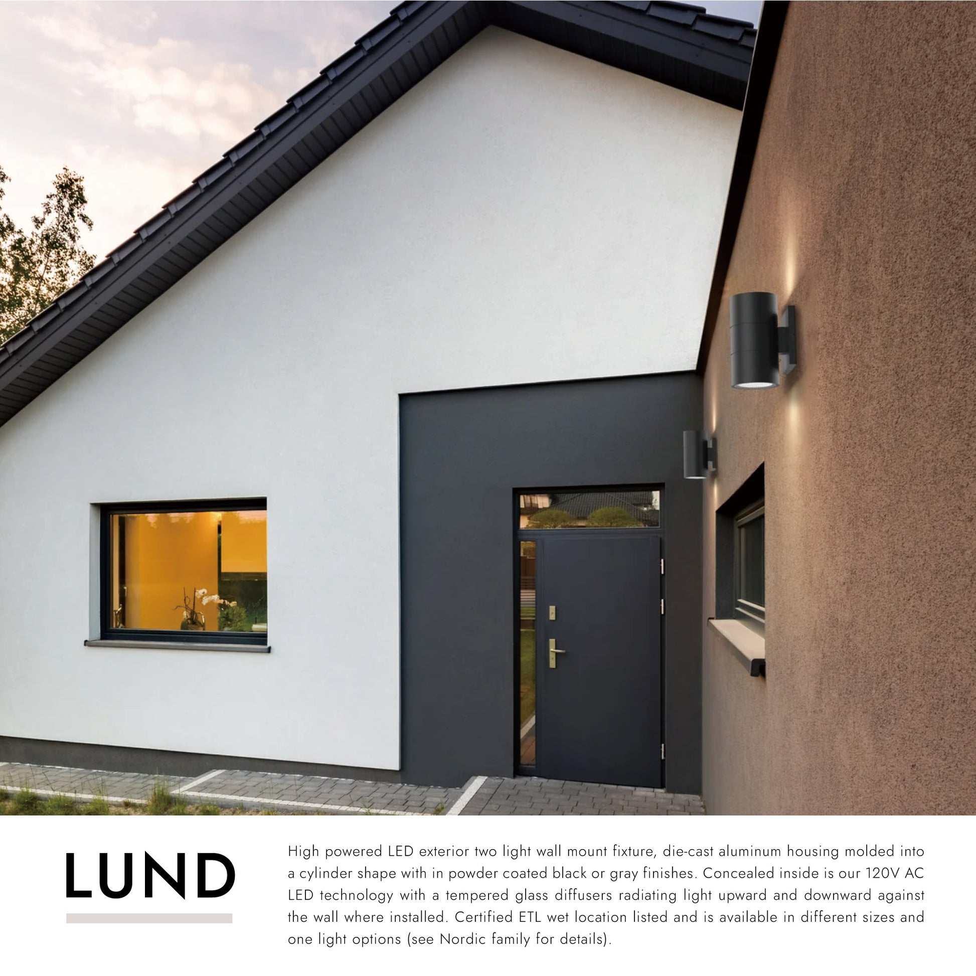 High powered LED exterior two light wall mount fixture, die-cast aluminum housing molded into a cylinder shape with in powder coated black or gray finishes. Concealed inside is our 120V AC LED technology with a tempered glass diffusers radiating light upward and downward against the wall where installed. Certified ETL wet location listed and is available in different sizes and one light options (see Nordic family for details).