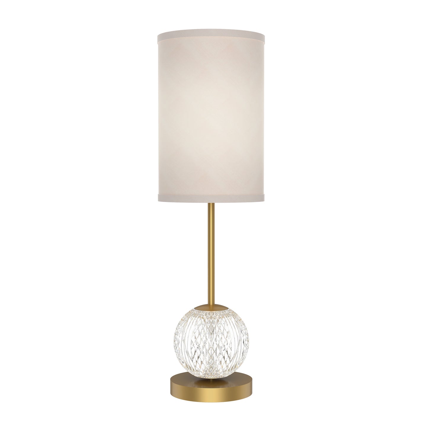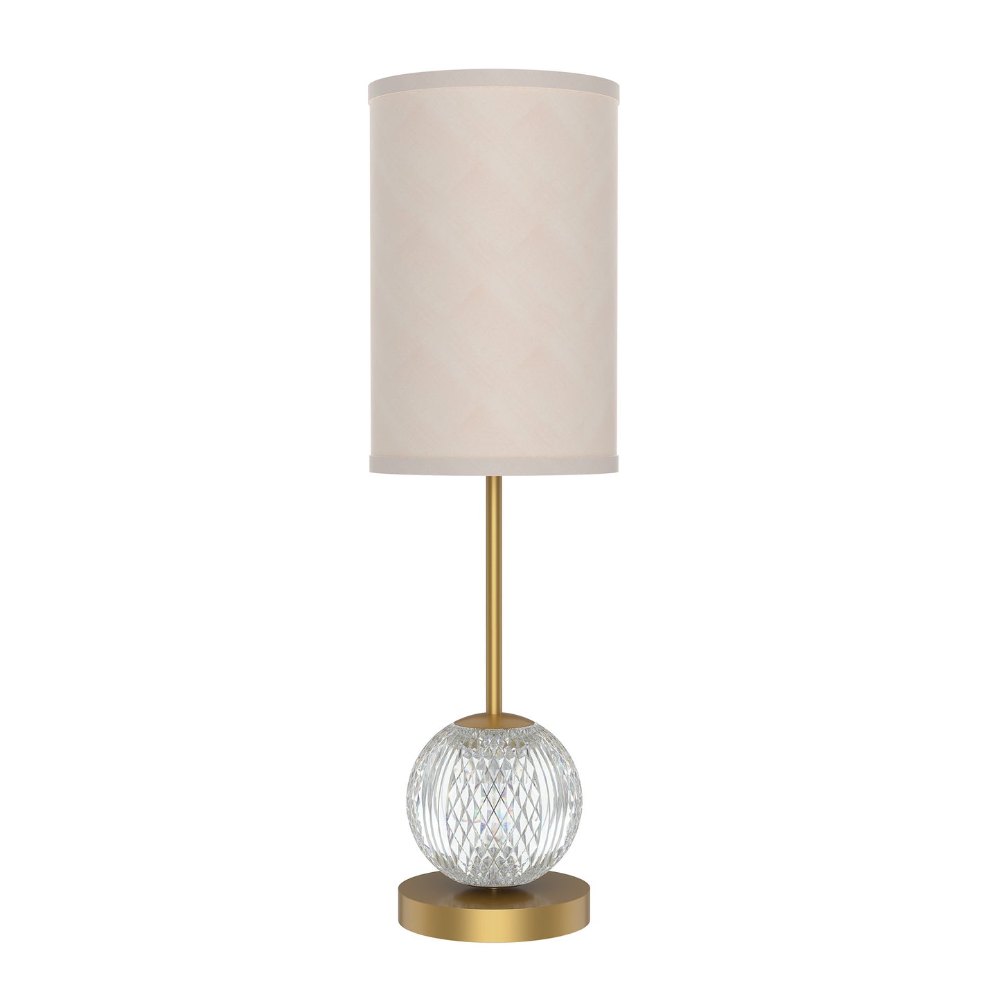 Like a gorgeously beaded garment, the Marni collection add luxury and interest to any design. Meticulously cut spherical shades create glittering beams of illumination throughout the design. Available in Polished Nickel and Natural Brass accompaniments. Lamp illuminates both from within the shade and the cut crystal base.