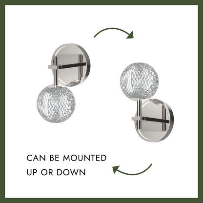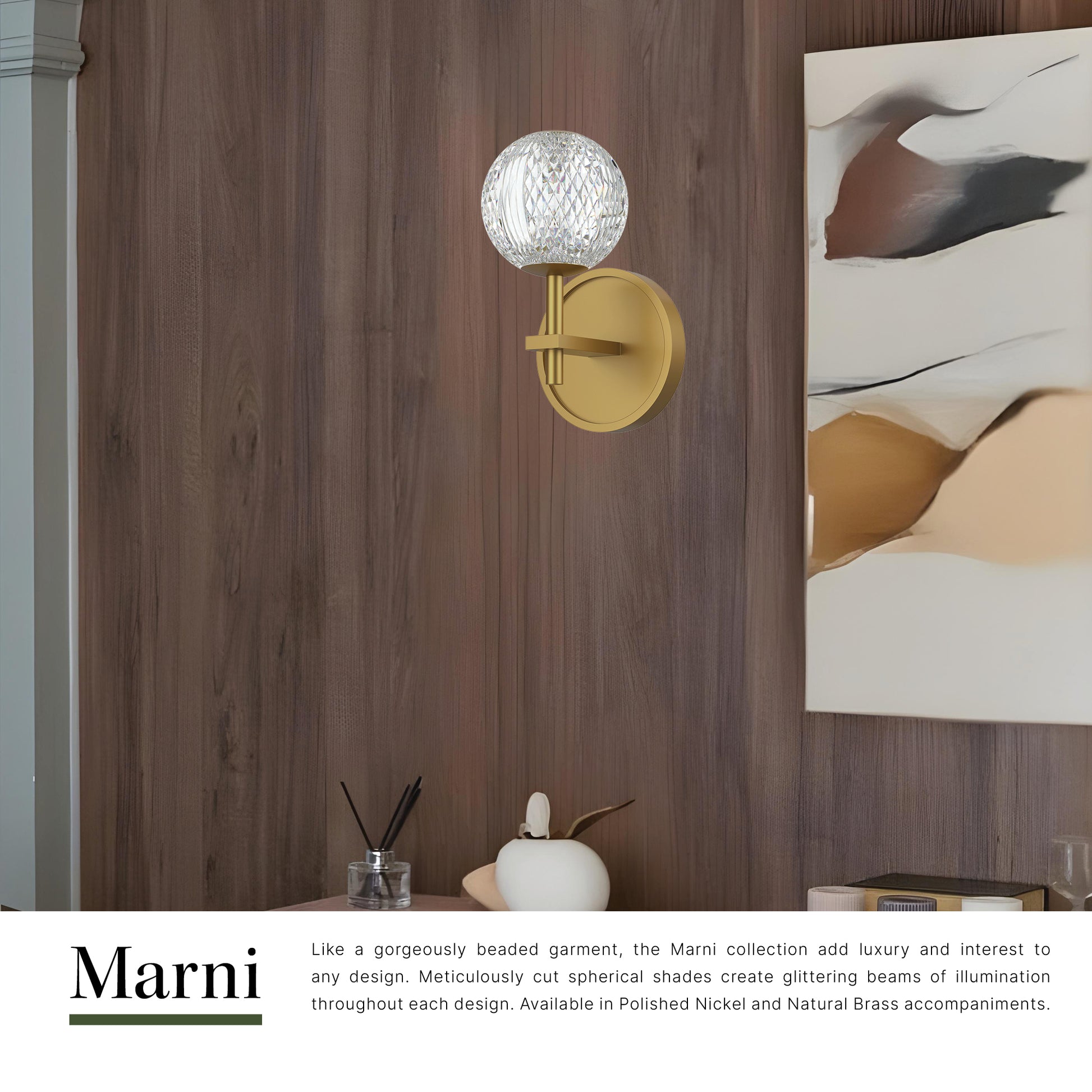 Like a gorgeously beaded garment, the Marni collection add luxury and interest to any design. Meticulously cut spherical shades create glittering beams of illumination throughout the design. Available in Polished Nickel and Natural Brass accompaniments.