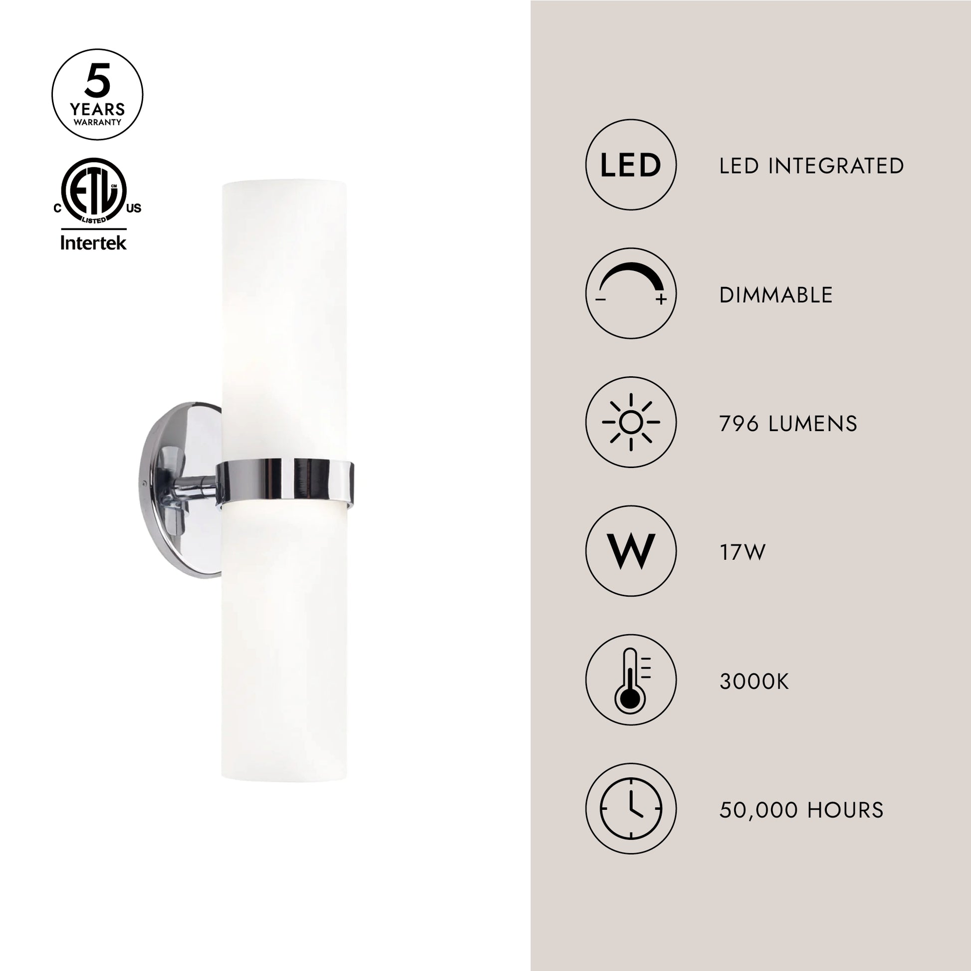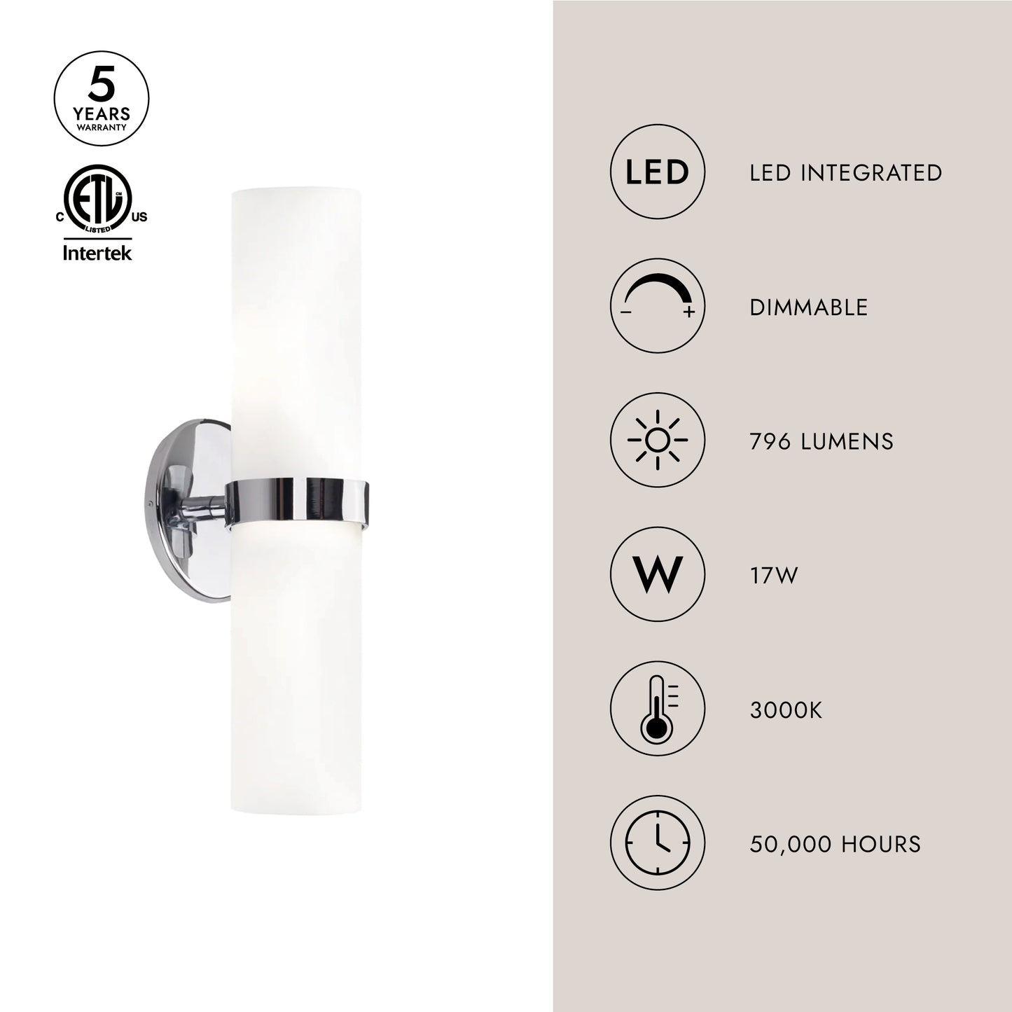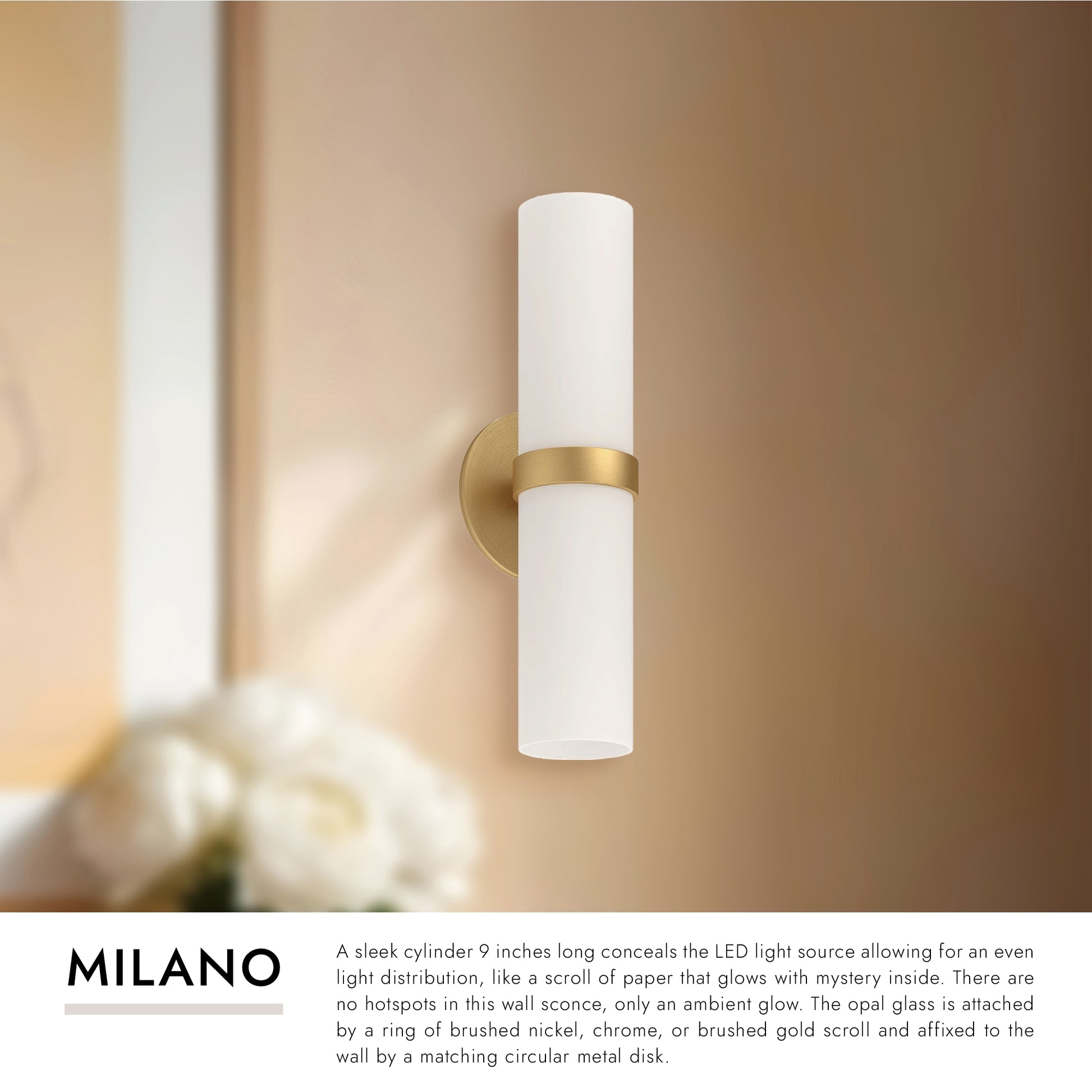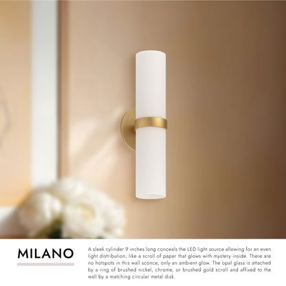A sleek cylinder 9 inches long conceals the LED light source allowing for an even light distribution, like a scroll of paper that glows with mystery inside. There are no hotspots in this wall sconce, only an ambient glow. The opal glass is attached by a ring of brushed nickel, chrome, or brushed gold scroll and affixed to the wall by a matching circular metal disk.