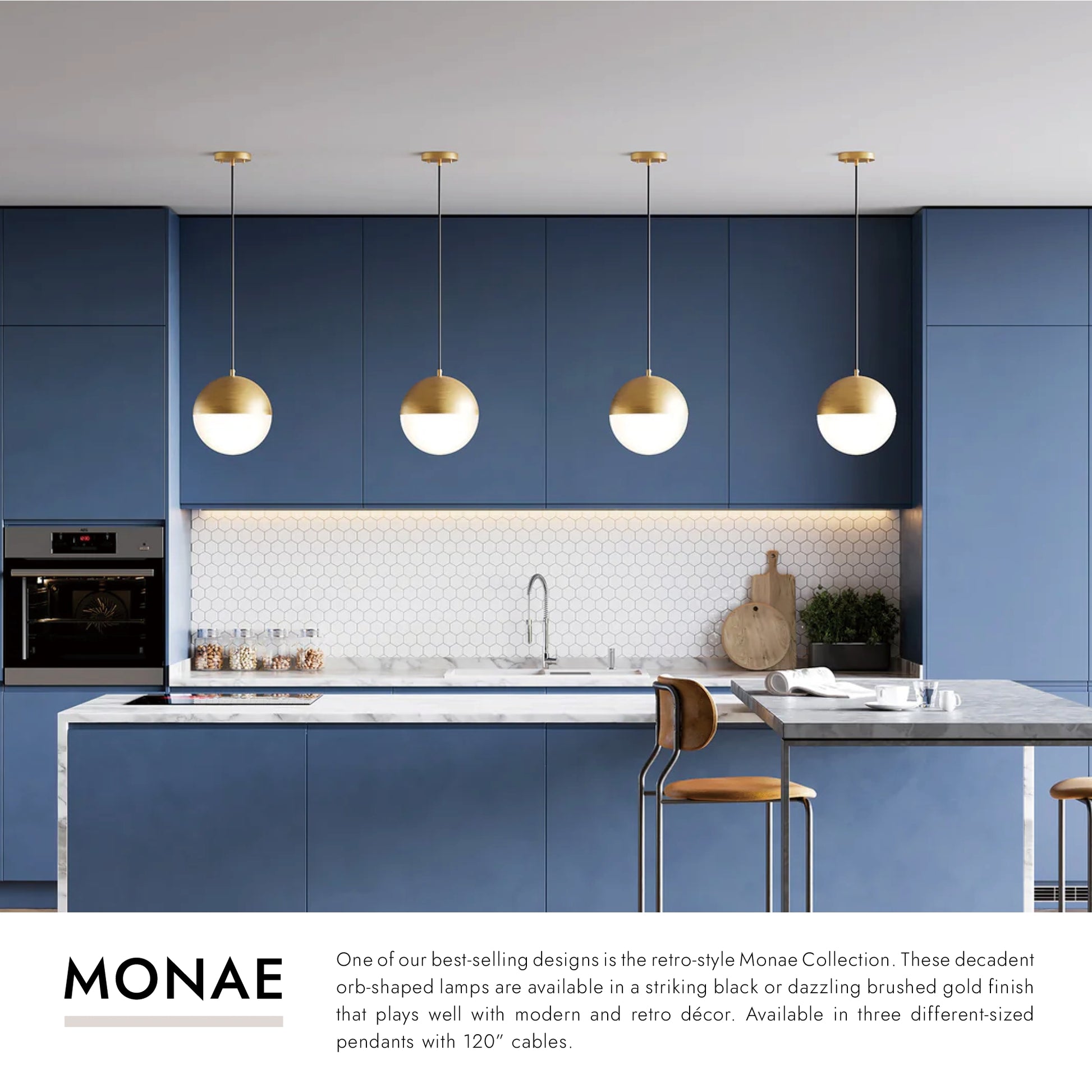 One of our best-selling designs is the retro-style Monae Collection. These decadent orb-shaped lamps are available in a striking black or dazzling brushed gold finish that plays well with modern and retro décor. Available in three different-sized pendants with 120" cables.