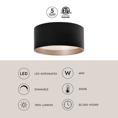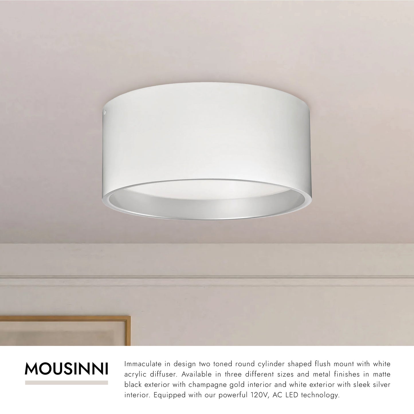 Immaculate in design two toned round cylinder shaped flush mount with white acrylic diffuser. Available in three different sizes and metal finishes in matte black exterior with champagne gold interior and white exterior with sleek silver interior. Equipped with our powerful 120V, AC LED technology