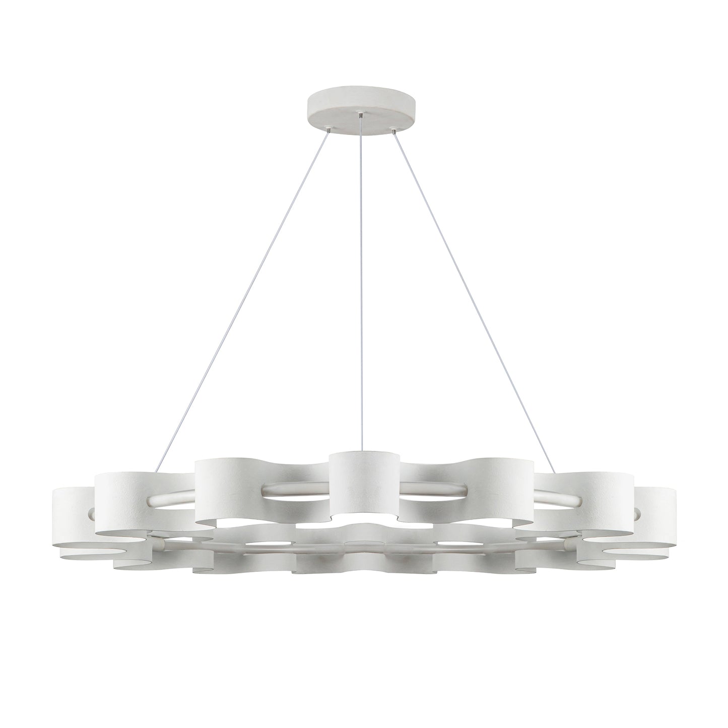 The Nami collection creates organic waves throughout its fluid design. The outer ring of the Nami chandelier provides organic structure, sculpted out of aluminum, and finished in either Glossy Black or Antique White. The inner ring provides ample yet soft illumination to the design, reflecting off of the metal layer elegantly.