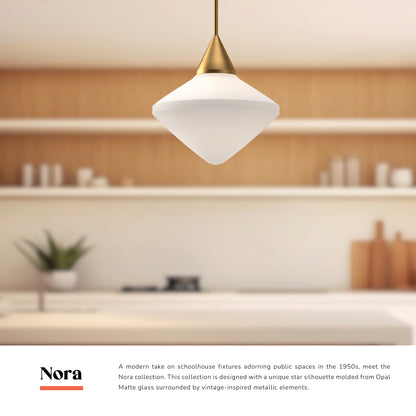 A modern take on schoolhouse fixtures adorning public spaces in the 1950s, meet the Nora collection. This collection is designed with a unique star silhouette molded from Opal Matte glass surrounded by vintage-inspired metallic elements.