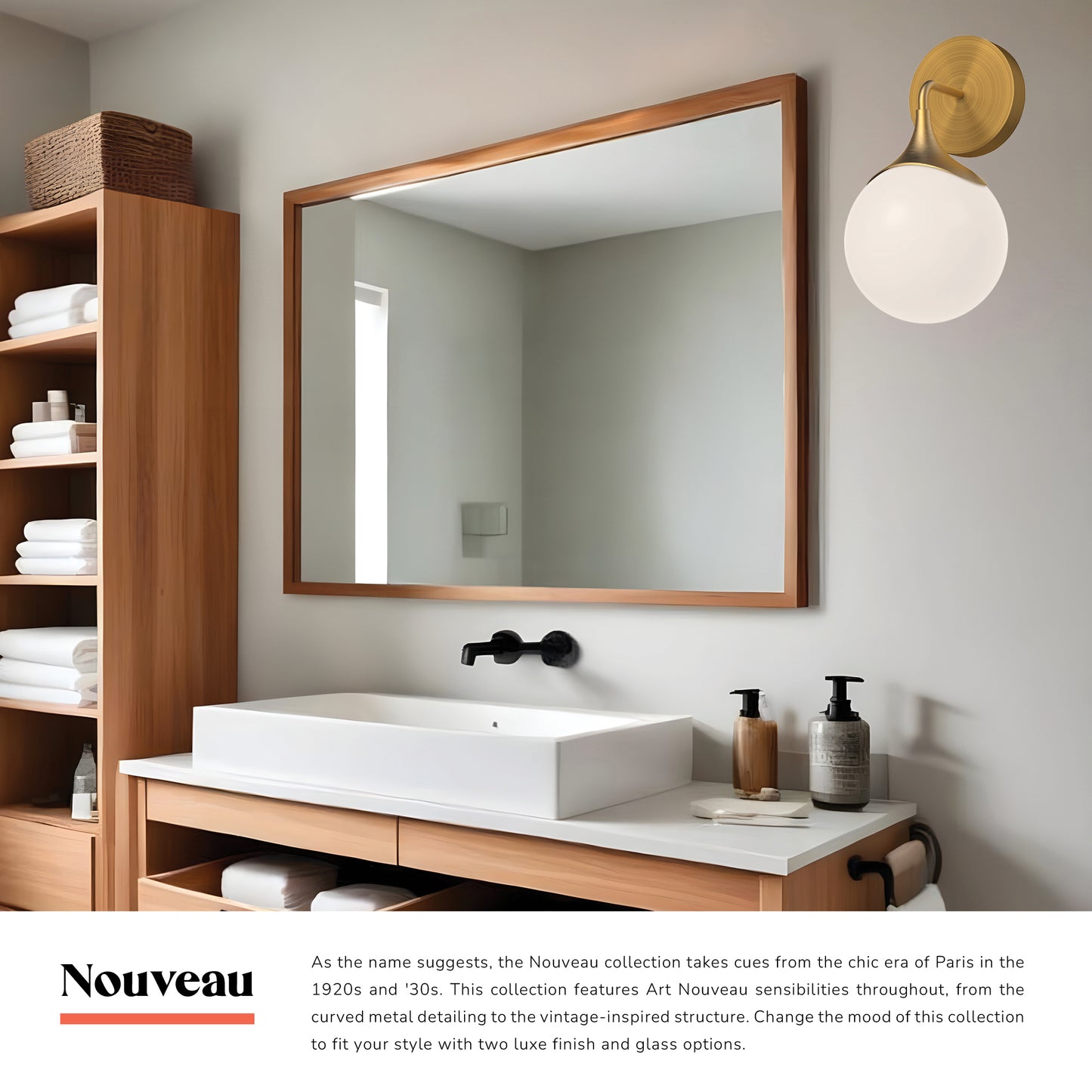 As the name suggests, the Nouveau collection takes cues from the chic era of Paris in the 1920s and '30s. This collection features Art Nouveau sensibilities throughout, from the curved metal detailing to the vintage-inspired structure. Change the mood of this collection to fit your style with two luxe finish and glass options.