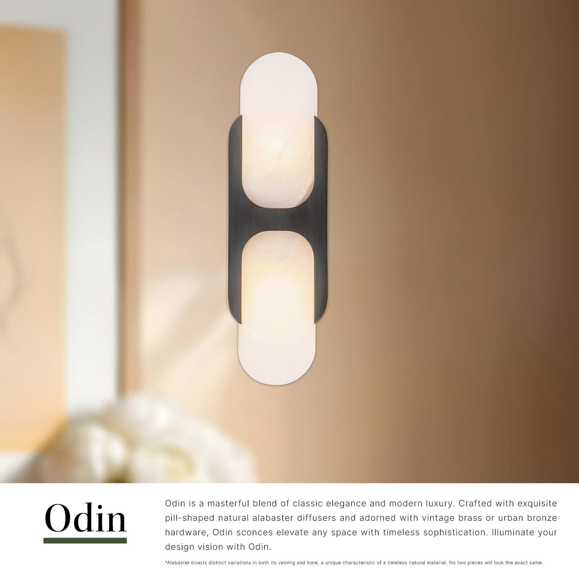 Odin is a masterful blend of classic elegance and modern luxury. Crafted with exquisite pill-shaped natural alabaster diffusers and adorned with vintage brass or urban bronze hardware, Odin sconces elevate any space with timeless sophistication. Illuminate your design vision with Odin.