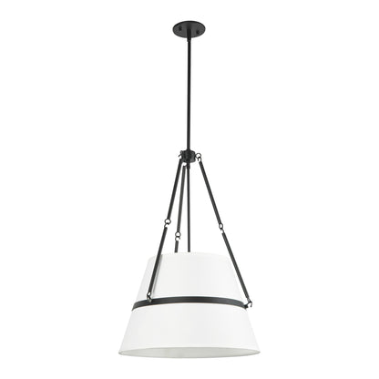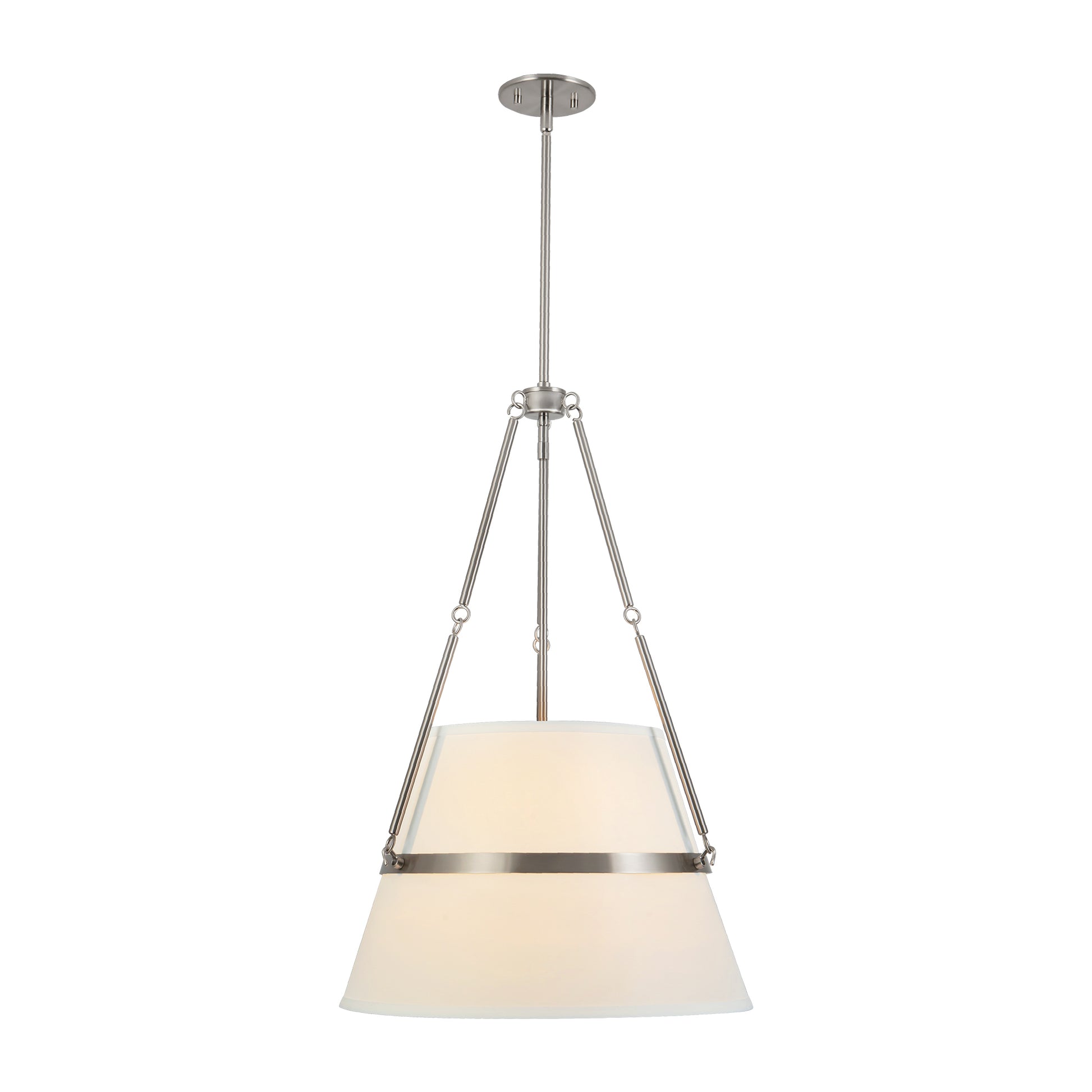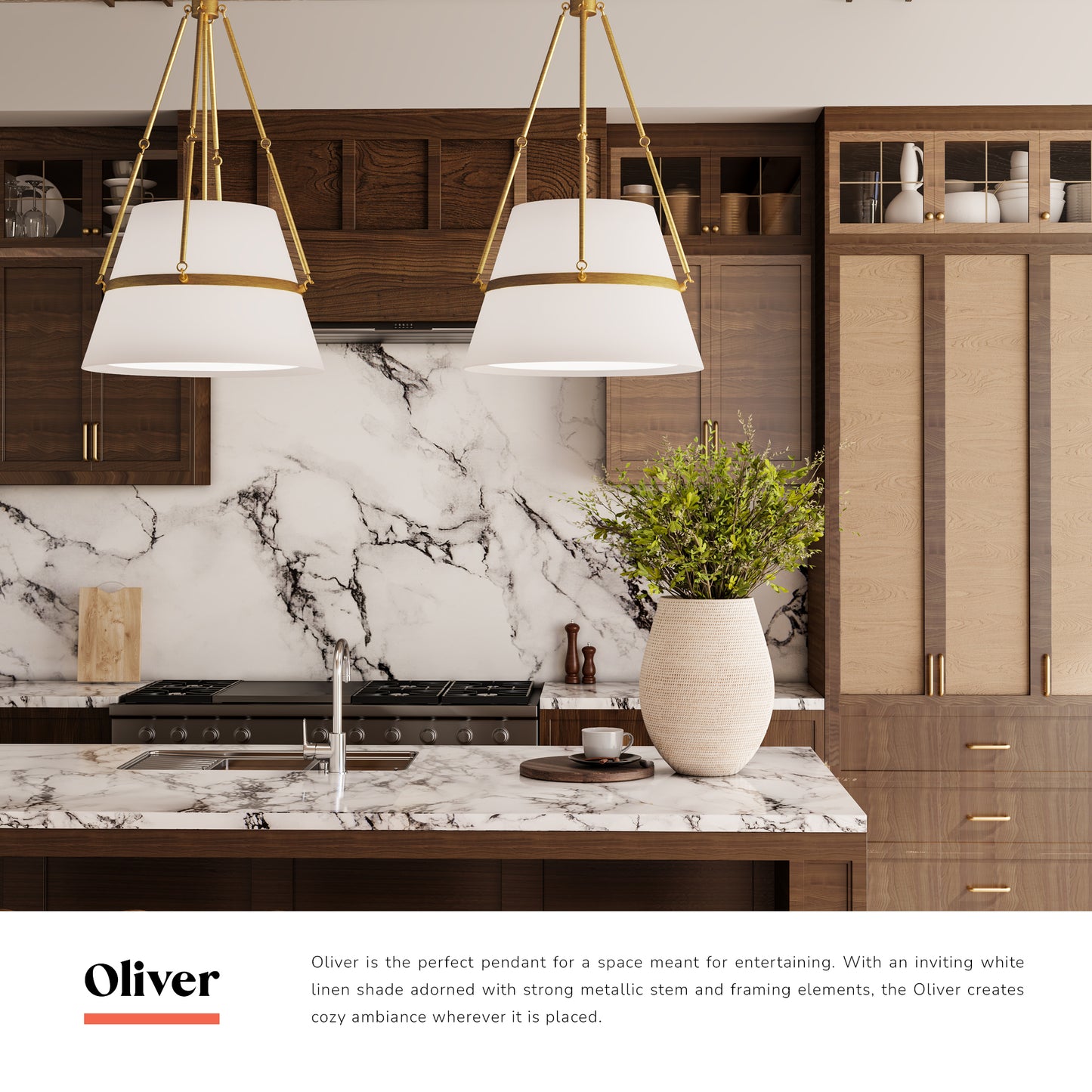 Oliver is the perfect pendant for a space meant for entertaining. With an inviting white linen shade adorned with strong metallic stem and framing elements, the Oliver creates cozy ambiance wherever it is placed.
