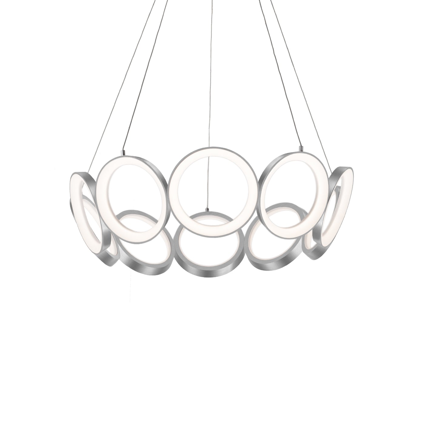 Die-cast aluminum rings with translucent acrylic diffusers. Metallic brushed or matte powder-coat finish. Outward emitting light. Custom options available.