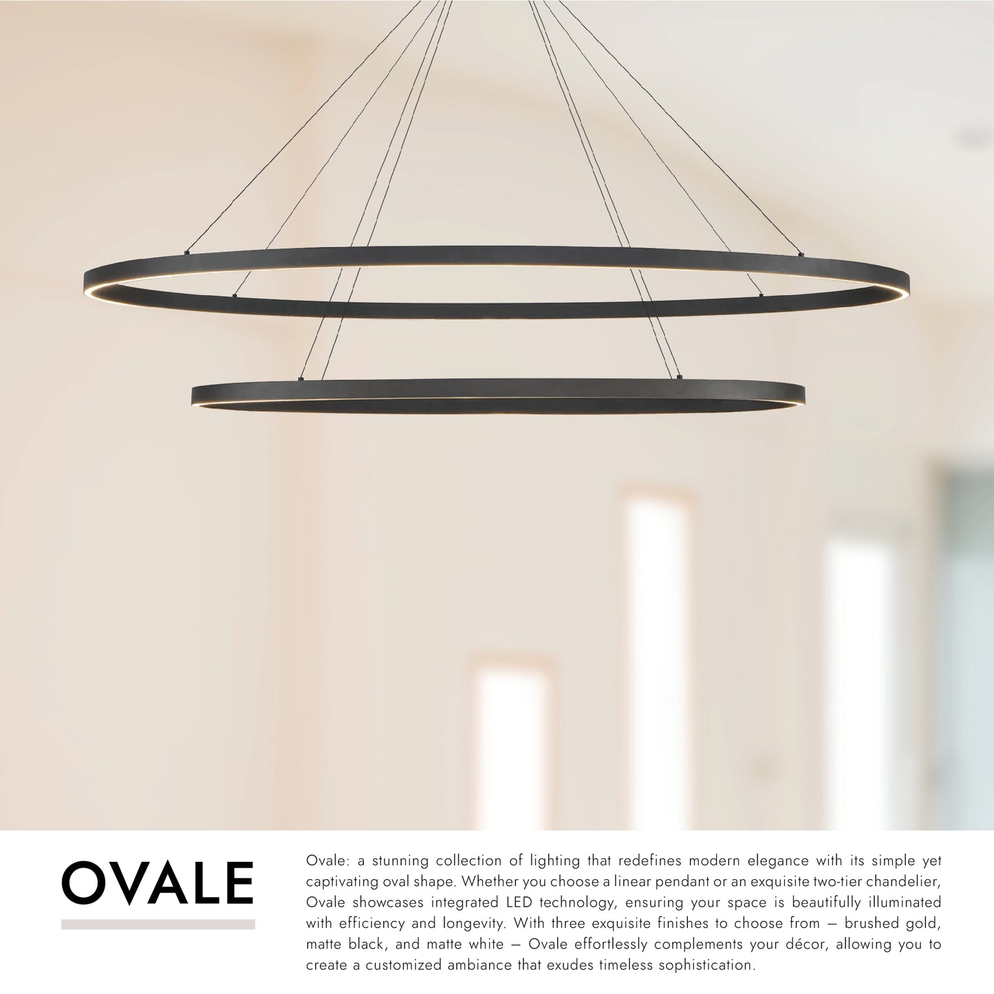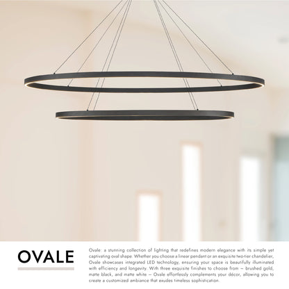 Ovale: a stunning collection of lighting that redefines modern elegance with its simple yet captivating oval shape. Whether you choose a linear pendant or an exquisite two-tier chandelier, Ovale showcases integrated LED technology, ensuring your space is beautifully illuminated with efficiency and longevity. With three exquisite finishes to choose from – brushed gold, matte black, and matte white – Ovale effortlessly complements your décor, allowing you to create a customized ambiance that exudes timeless sophistication.