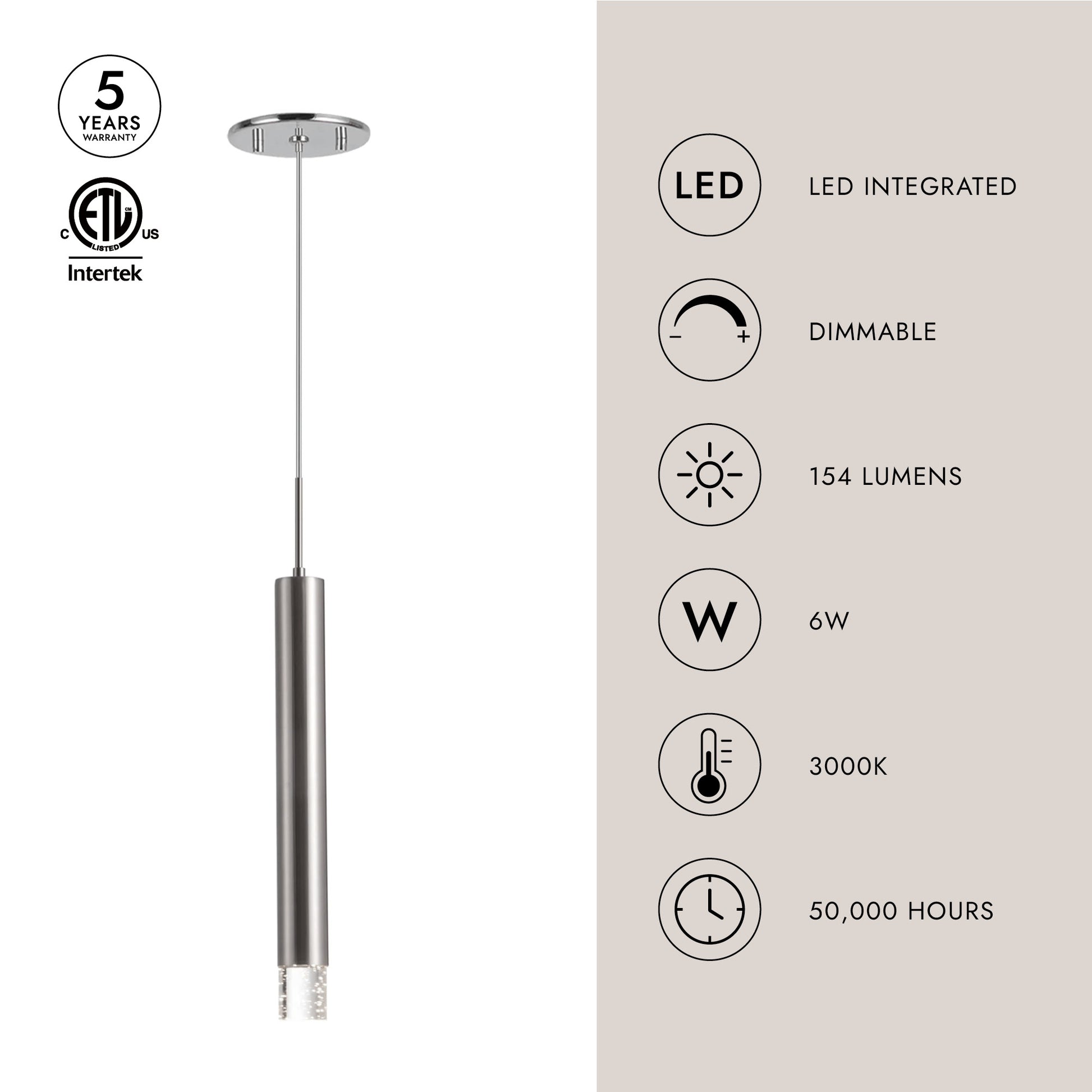 Single LED Pendant with long sleek metal housing and short bubble encased crystal. Chrome metal details and Kuzco SSL wire, provided with our powerful 120V AC LED technology.