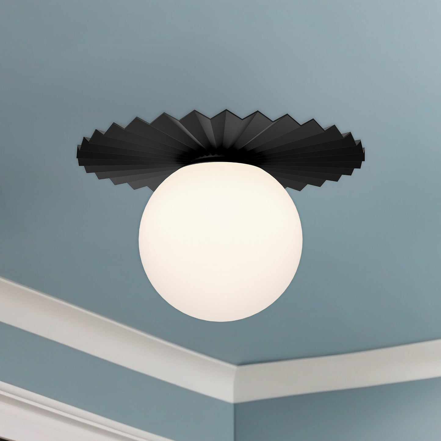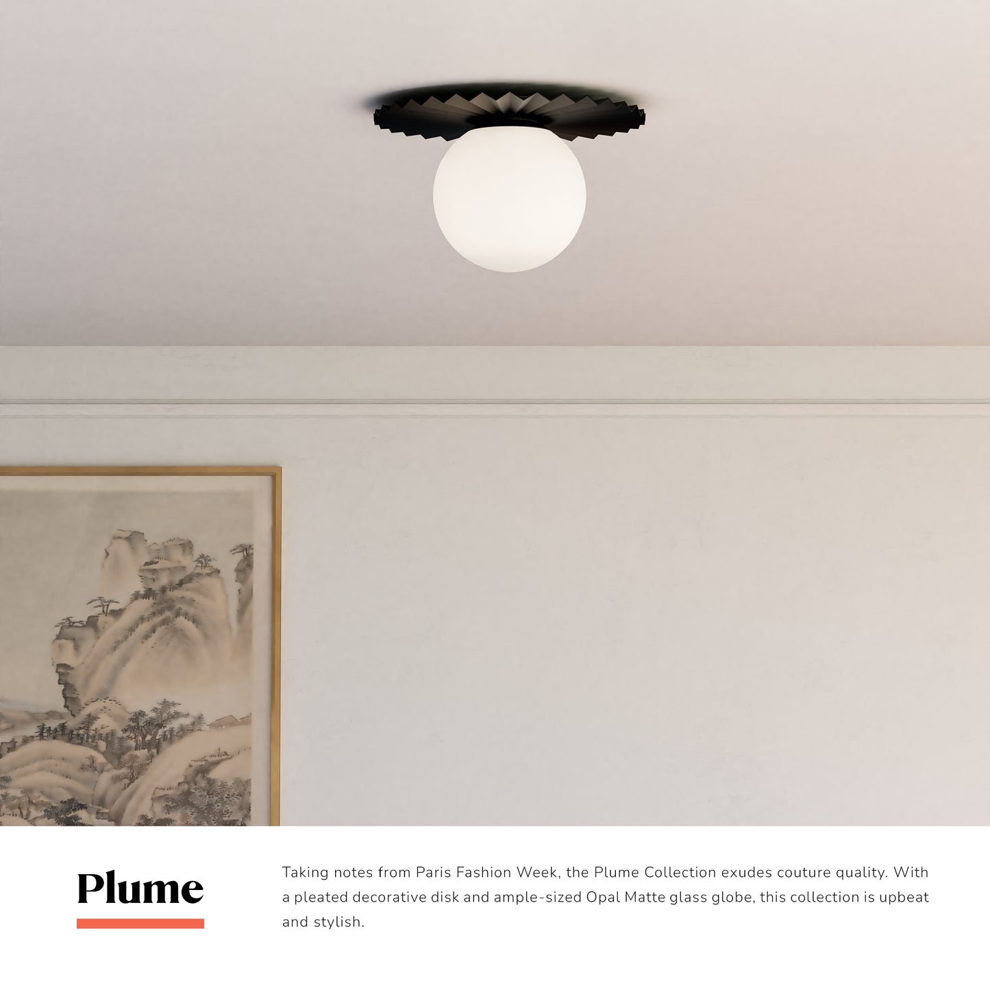 Taking notes from Paris Fashion Week, the Plume Collection exudes couture quality. With a pleated decorative disk and ample-sized Opal Matte glass globe, this collection is upbeat and stylish.
