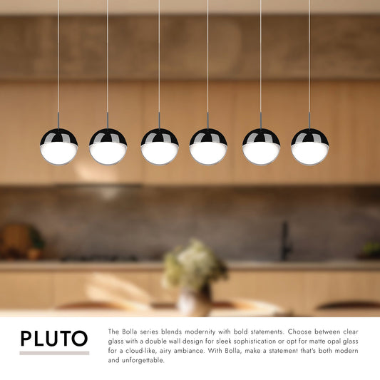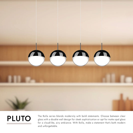 A timeless spherical geometry is inherent to the Pluto pendant. A split line at the globe equator separates complementary plated LED housing from translucent diffuser. The multiple color options make the fixture a perfect furnishing accent or, in multiples, a focal point.