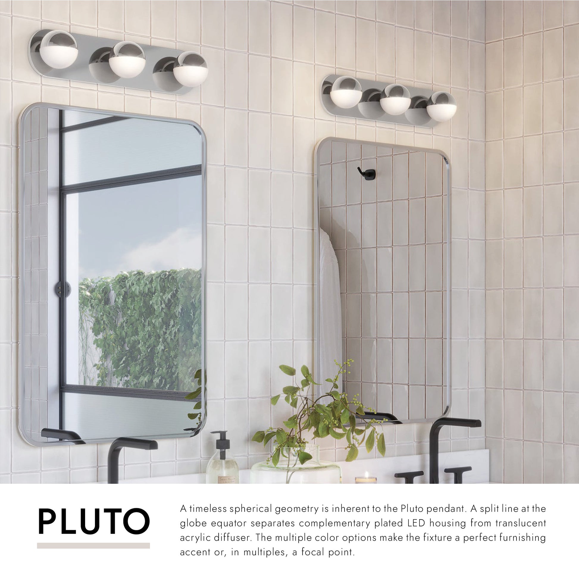 A timeless spherical geometry is inherent to the Pluto pendant. A split line at the globe equator separates complementary plated LED housing from translucent diffuser. The multiple color options make the fixture a perfect furnishing accent or, in multiples, a focal point.