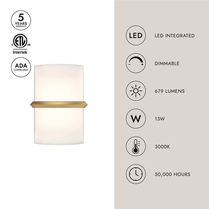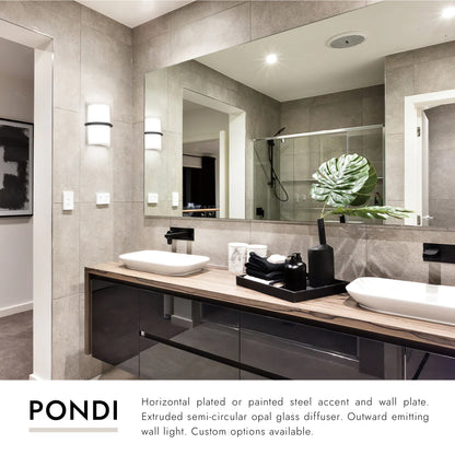 Horizontal plated or painted steel accent and wall plate. Extruded semi-circular opal glass diffuser. Outward emitting wall light. Custom options available.