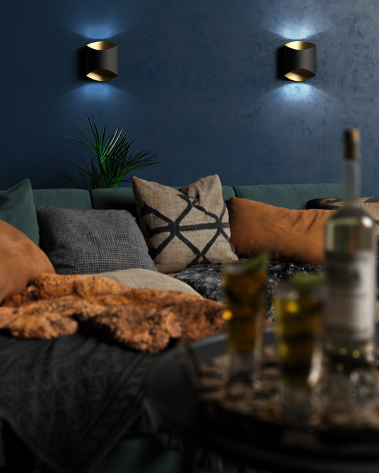 Single lamp LED wall sconce with either a flat black with fine gold interior or white with sleek silver interior unique metal casing. Equipped with our powerful 120V AC LED technology