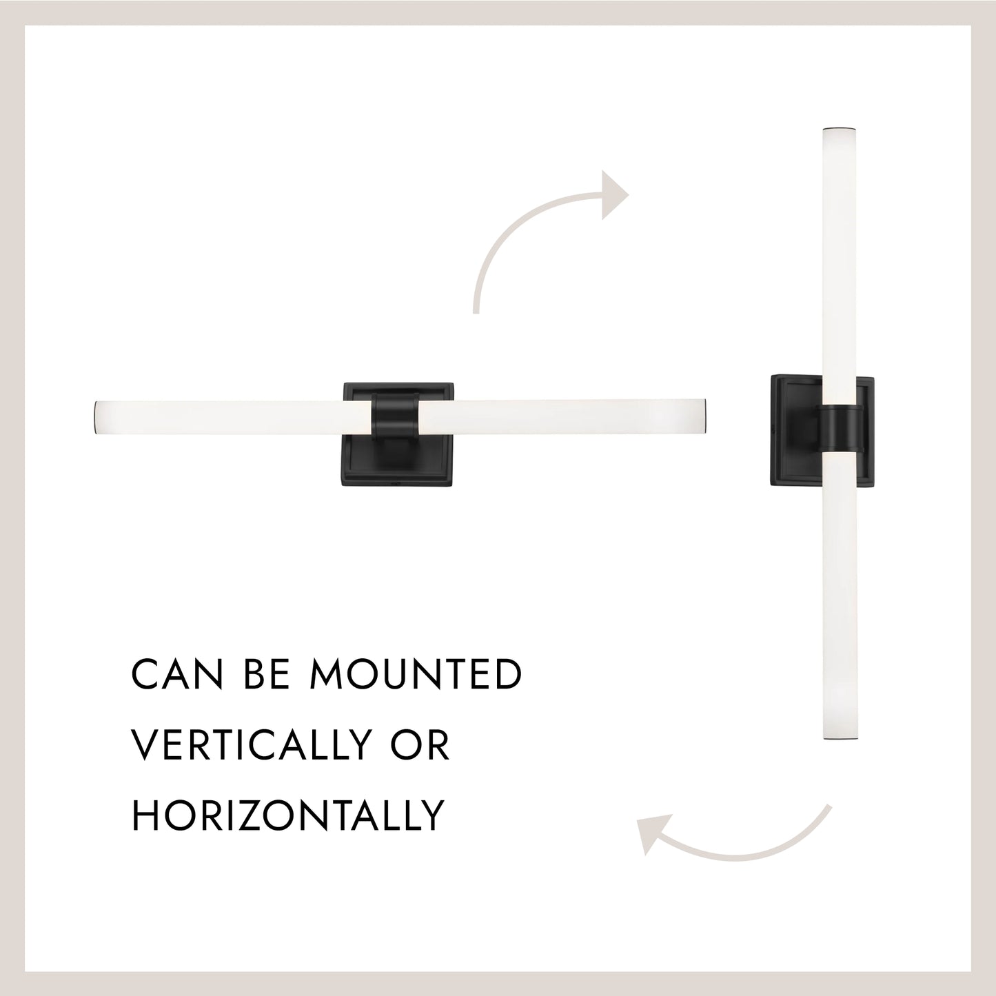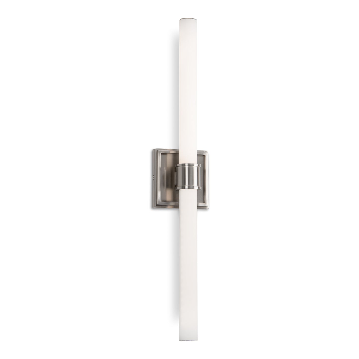 A tubular length of illuminated rod the Rona wall light is supported and clasped with a detailed cylindrical projection. The thick square outline of the attachment plate frames the lamp holder and echoes the refinement of present architectural trim. Available as either a sconce or vanity and in several curated finishes.
