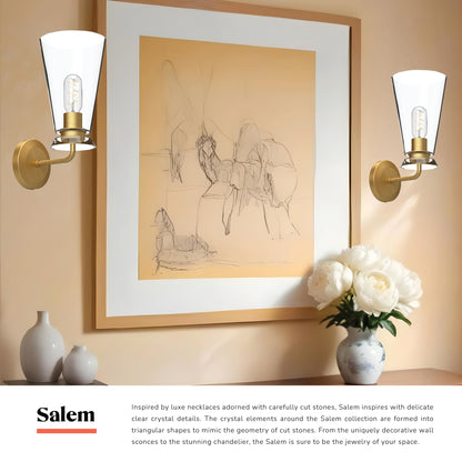 Inspired by luxe necklaces adorned with carefully cut stones, Salem inspires with delicate clear crystal details. The crystal elements around the Salem collection are formed into triangular shapes to mimic the geometry of cut stones. From the uniquely decorative wall sconces to the stunning chandelier, the Salem is sure to be the jewelry of your space.