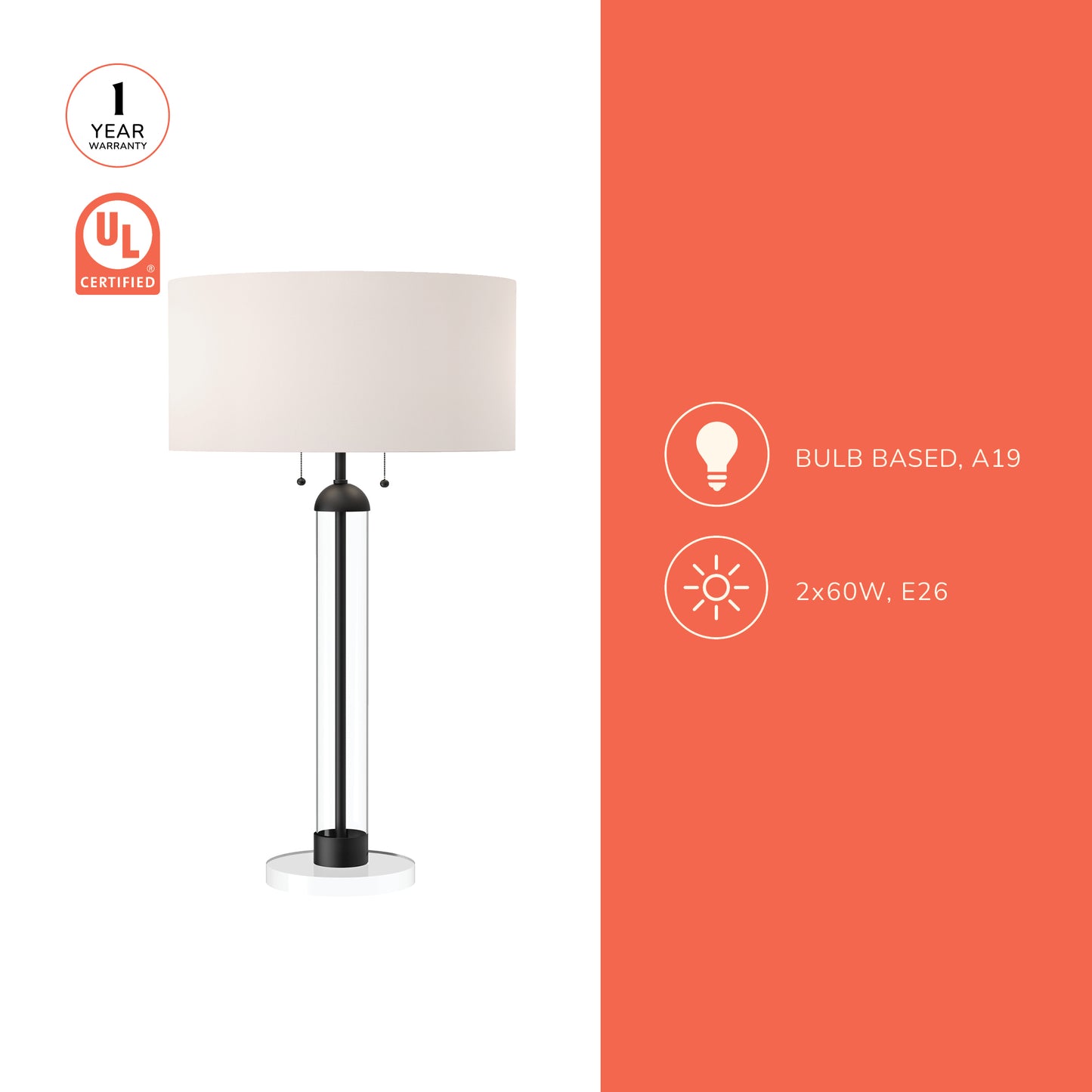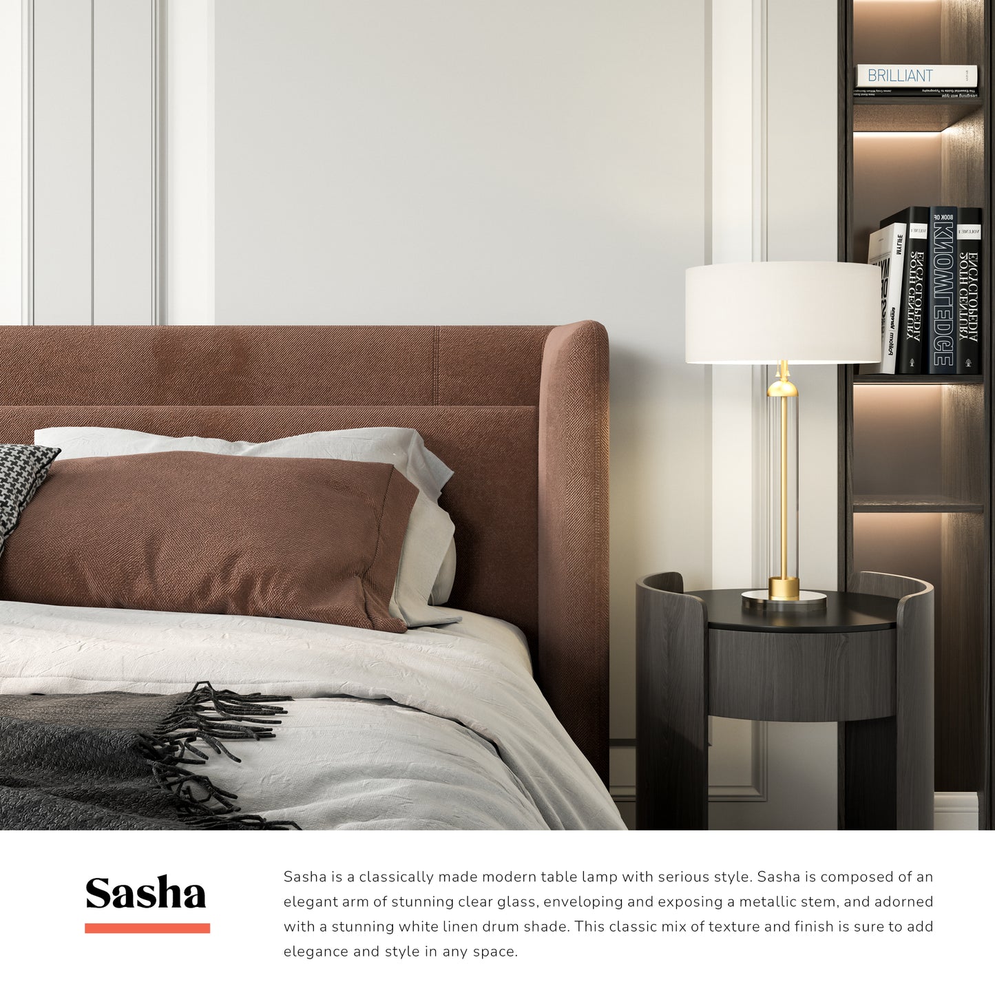 Sasha is a classically made modern table lamp with serious style. Sasha is composed of an elegant arm of stunning clear glass, enveloping and exposing a metallic stem, and adorned with a stunning white linen drum shade. This classic mix of texture and finish is sure to add elegance and style in any space.