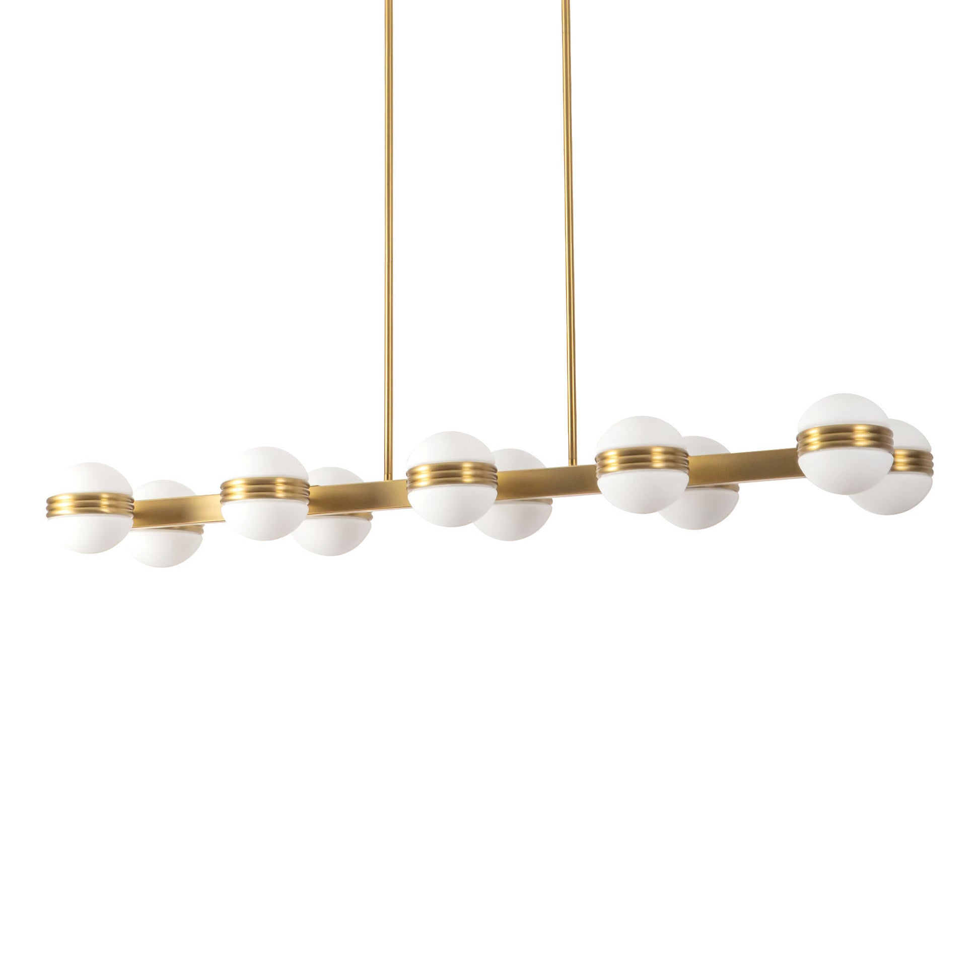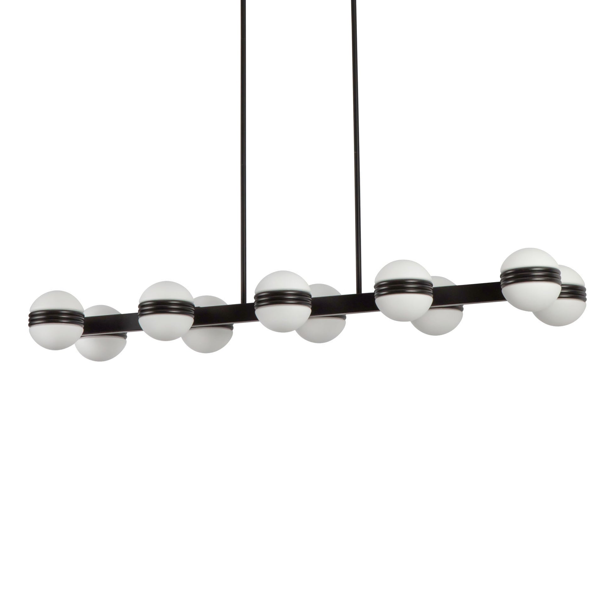 - Linear pendant by Peyton Fox featuring opal glass diffusers and sculptural metal rings