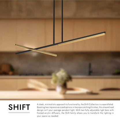 A sleek, minimalistic approach to functionality, the Shift Collection is unparalleled. Boasting two impressive-sized options in two eye-catching finishes, this streamlined design isn't your average pendant light. With two fully adjustable light bars with frosted acrylic diffusers, the Shift family allows you to transform the lighting in your space as needed.