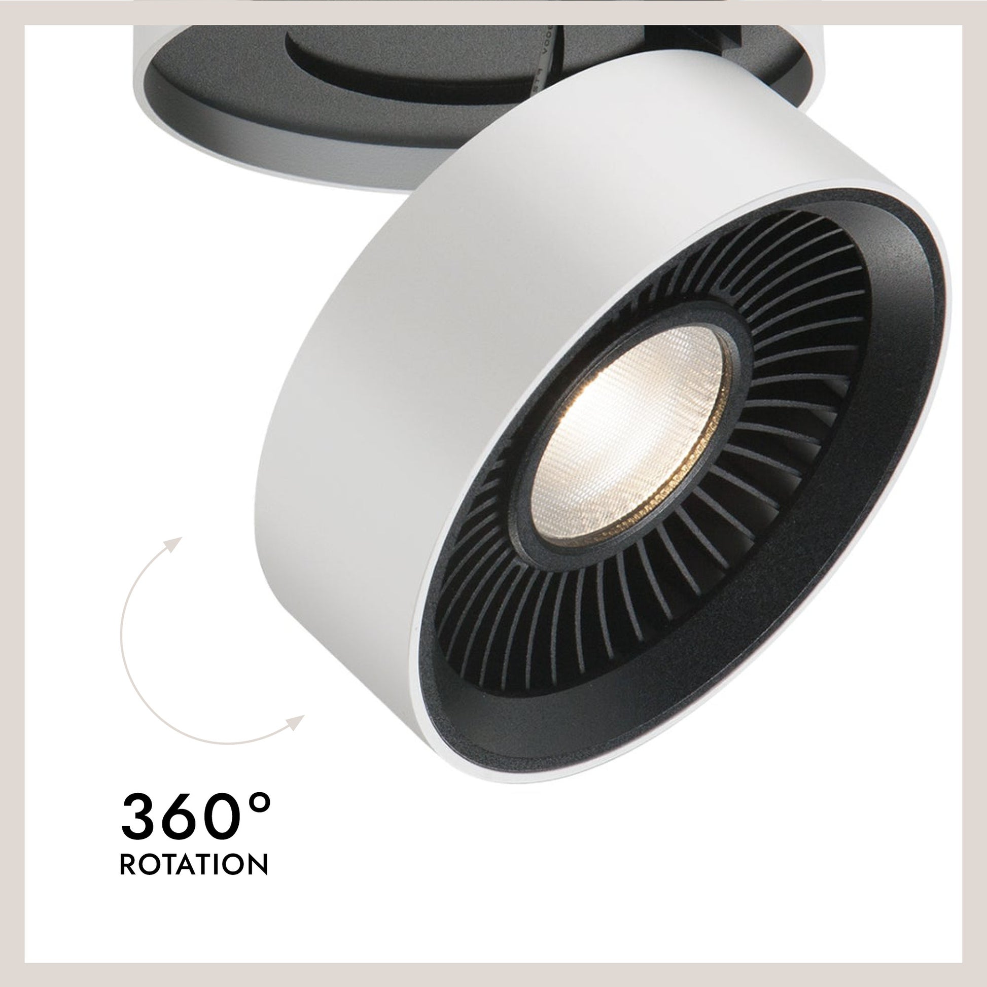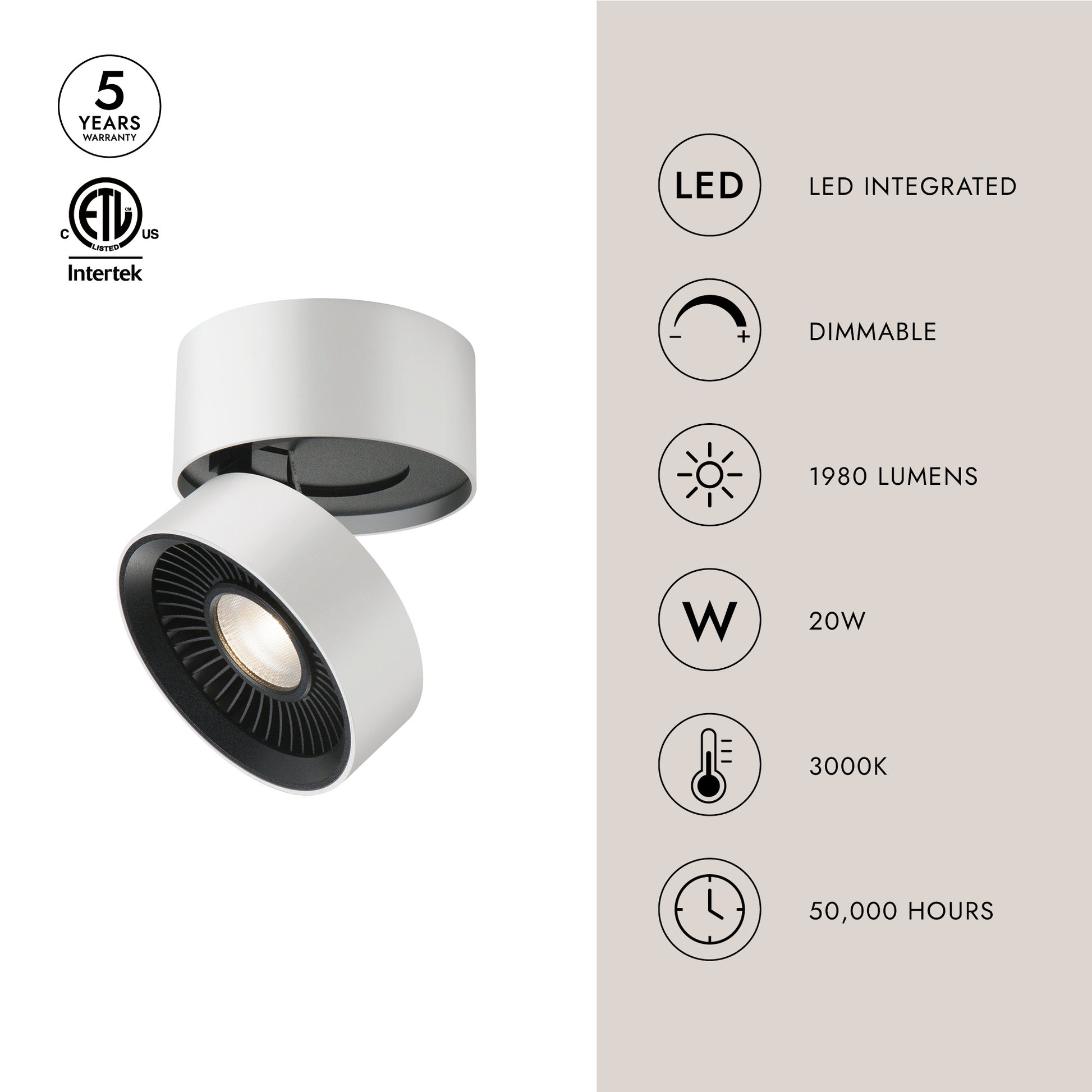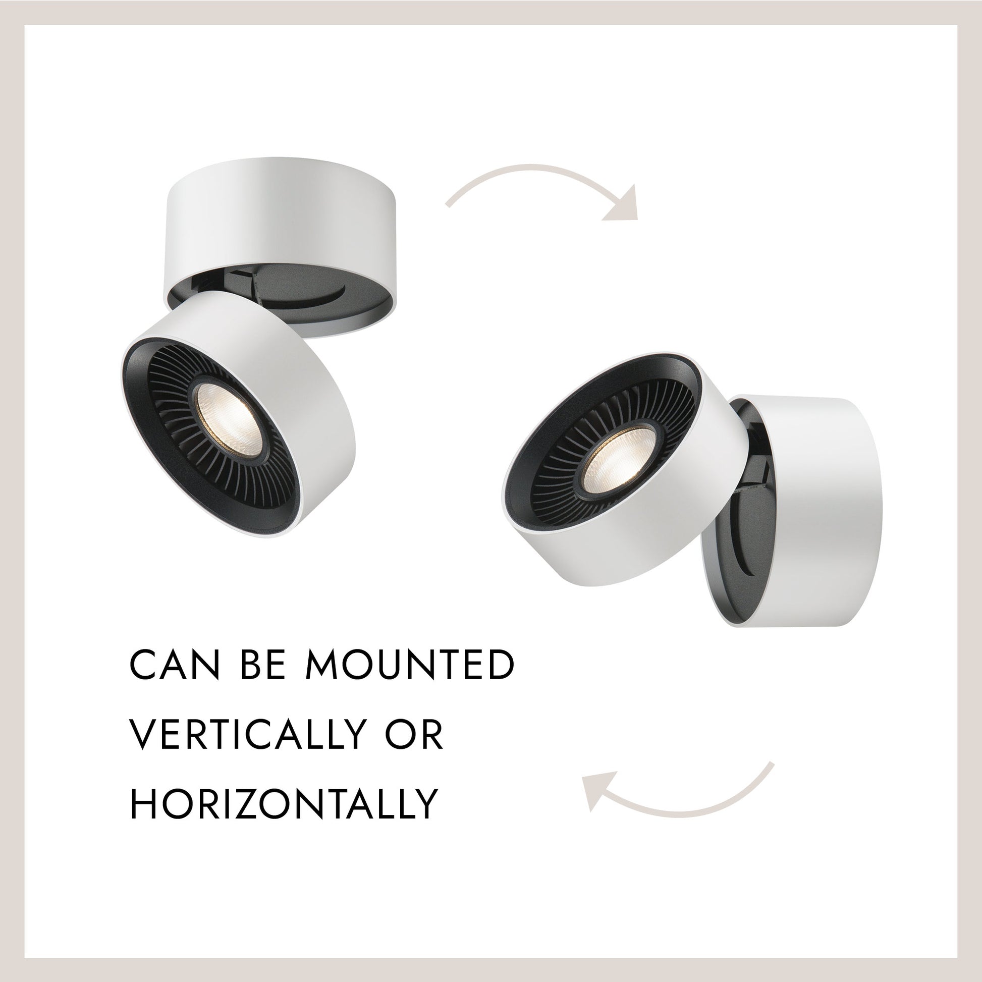 LED flush mount made from heavy gauge cast aluminum painted white or black, round cylinder shaped. Adjustable from mounting position 90 degrees with a 360 degrees radius. Perfect for commercial use to control the exact point to direct the light to weather it's against a wall, product display or many other applications. May be wall or ceiling mounted.