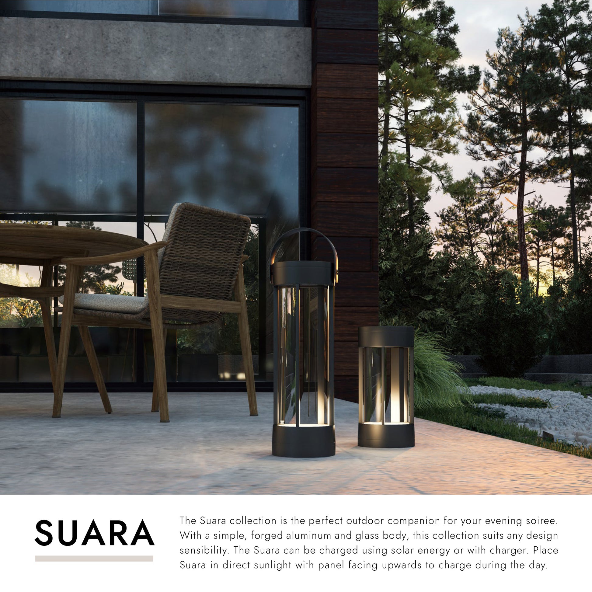 The Suara collection is the perfect outdoor companion for your evening soiree. With a simple, forged aluminum and glass body, this collection suits any design sensibility. The Suara can be charged using solar energy or with charger. Place Suara in direct sunlight with panel facing upwards to charge during the day.