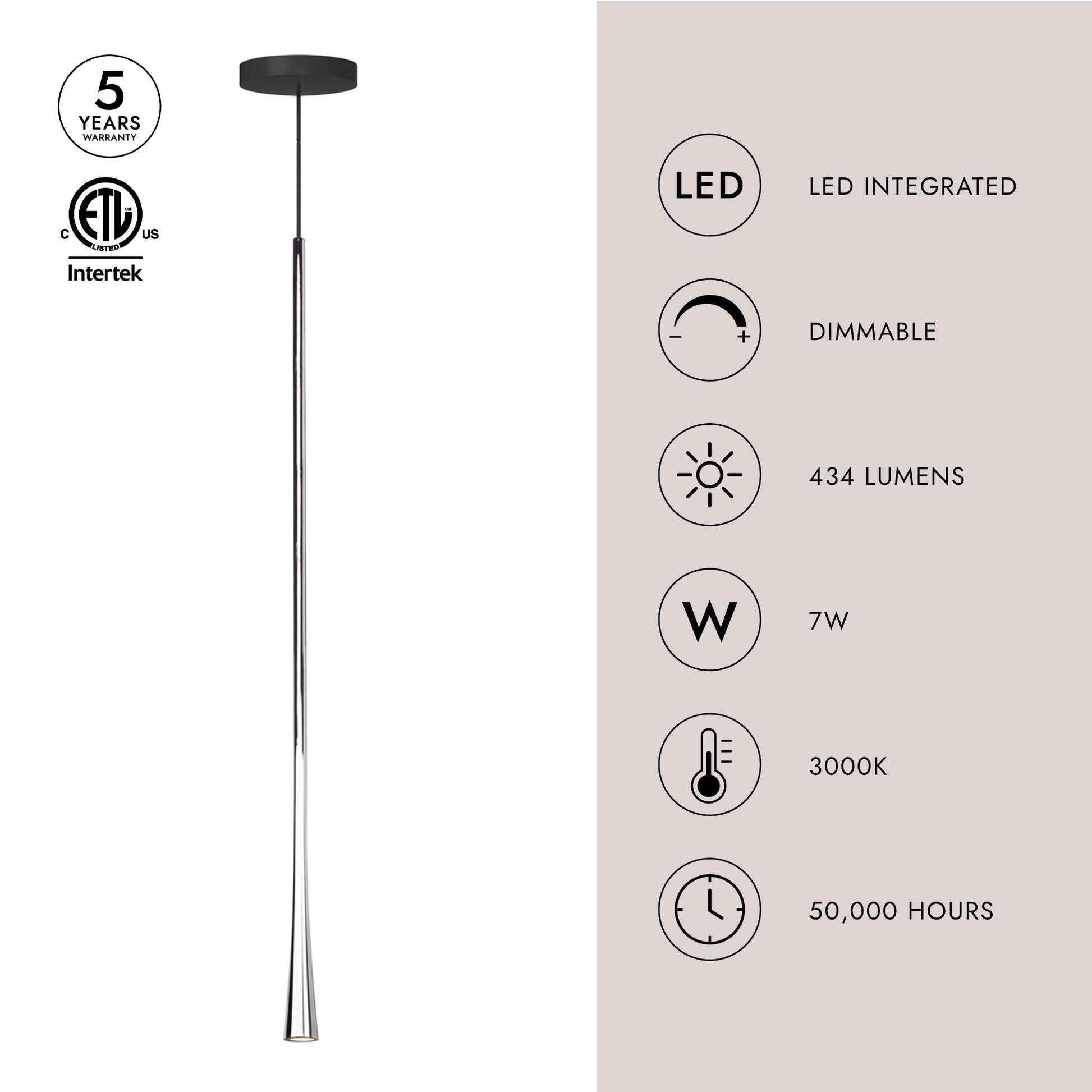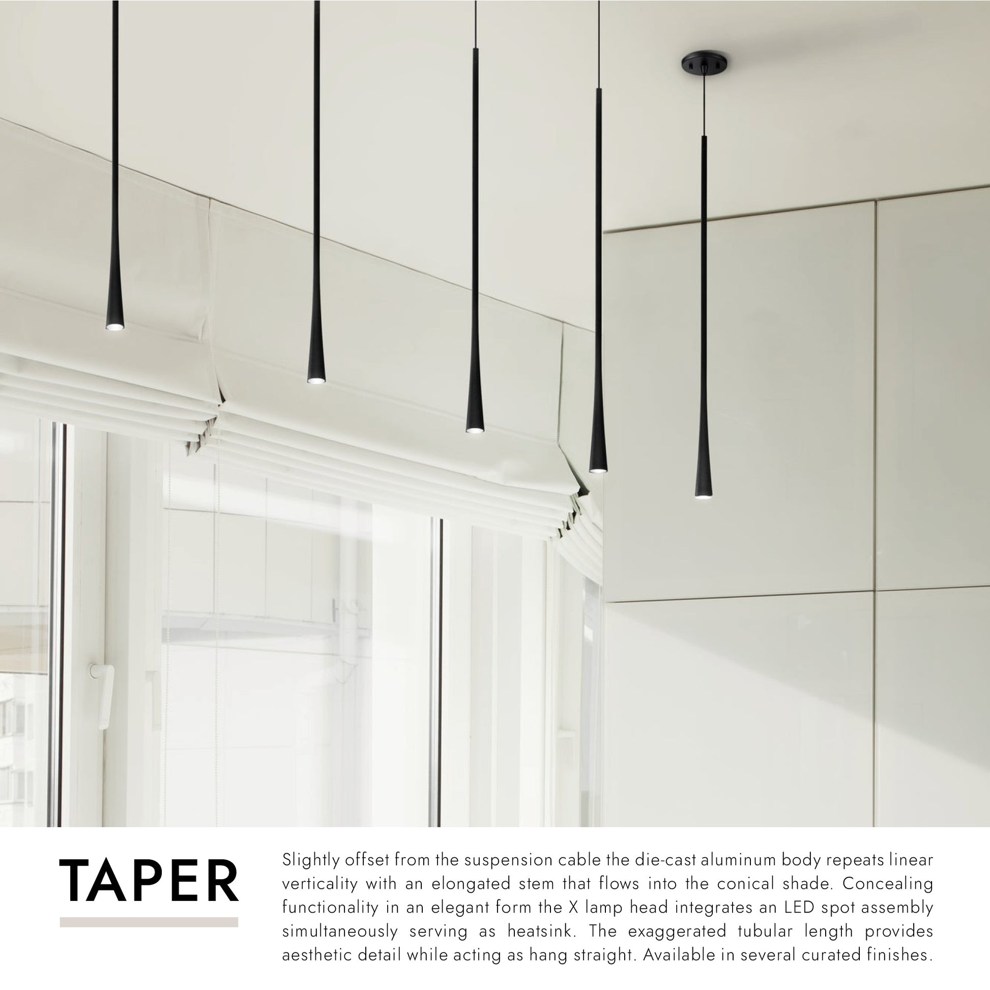 Slightly offset from the suspension cable the die-cast aluminum body repeats linear verticality with an elongated stem that flows into the conical shade. Concealing functionality in an elegant form the X lamp head integrates an LED spot assembly simultaneously serving as heatsink. The exaggerated tubular length provides aesthetic detail while acting as hang straight. Available in several curated finishes.