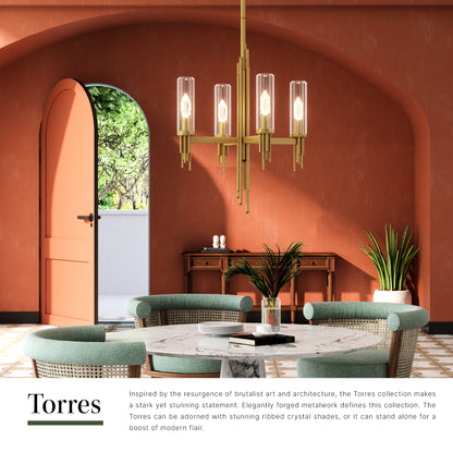 Inspired by the resurgence of brutalist art and architecture, the Torres collection makes a stark yet stunning statement. Elegantly forged metalwork defines this collection. The Torres can be adorned with stunning ribbed crystal shades, or it can stand alone for a boost of modern flair.