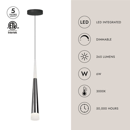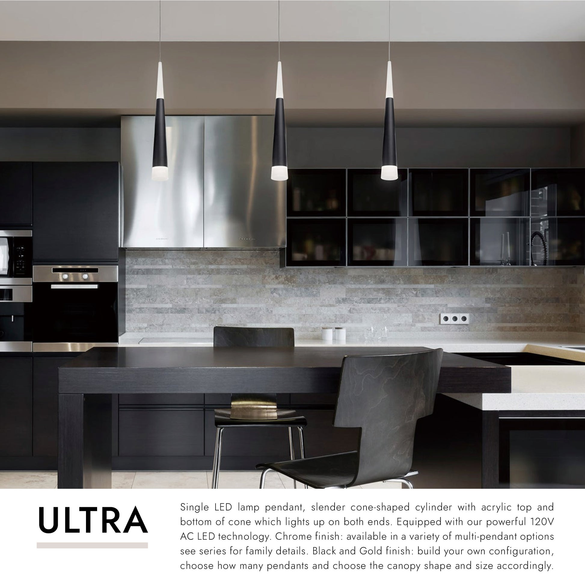 Single LED lamp pendant, slender cone-shaped cylinder with acrylic top and bottom of cone which lights up on both ends. Equipped with our powerful 120V AC LED technology. Chrome finish: available in a variety of multi-pendant options see series for family details. Black and Gold finish: build your own configuration, choose how many pendants and choose the canopy shape and size accordingly.