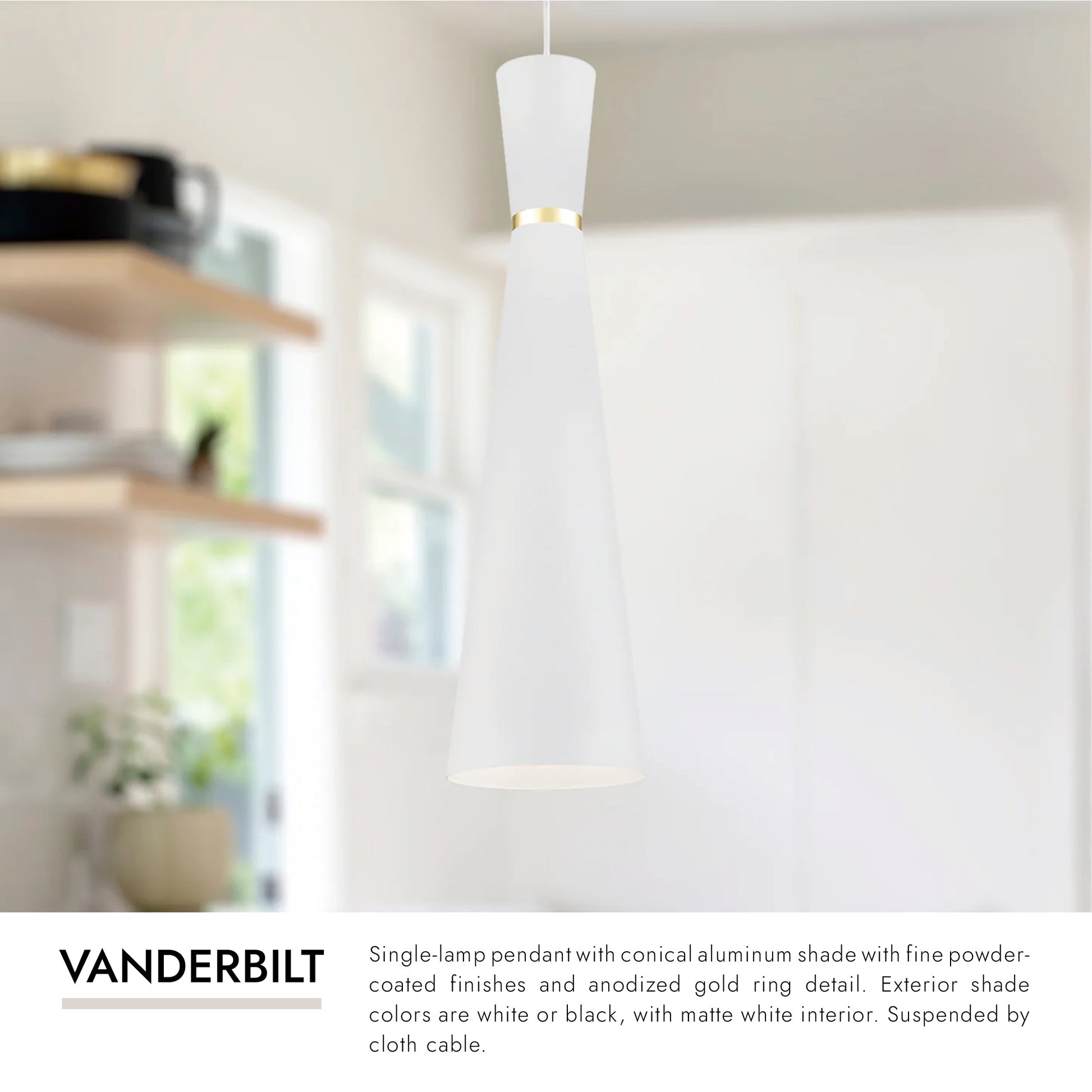 Single-lamp pendant with conical aluminum shade with fine powder-coated finishes and anodized gold ring detail. Exterior shade colors are white or black, with matte white interior. Suspended by cloth cable