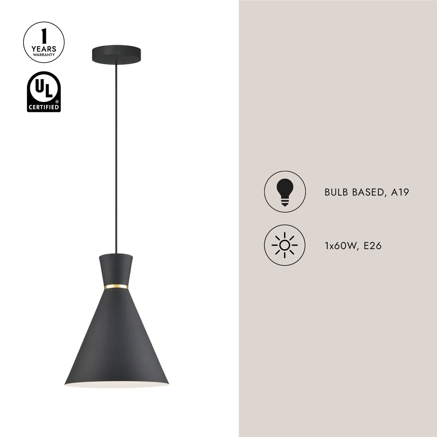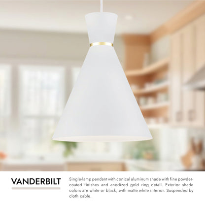 Single-lamp pendant with conical aluminum shade with fine powder-coated finishes and anodized gold ring detail. Exterior shade colors are white or black, with matte white interior. Suspended by cloth cable