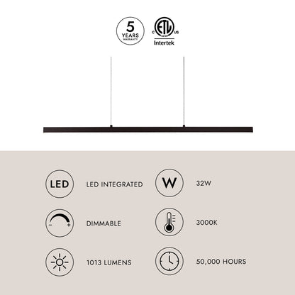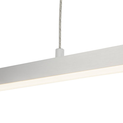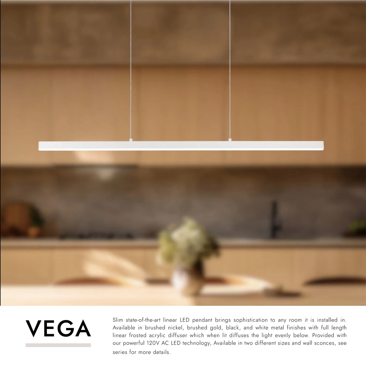 Slim state-of-the-art linear LED pendant brings sophistication to any room it is installed in. Available in brushed nickel, brushed gold, black, and white metal finishes with full length linear frosted acrylic diffuser which when lit diffuses the light evenly below. Provided with our powerful 120V AC LED technology, Available in two different sizes and wall sconces, see series for more details.