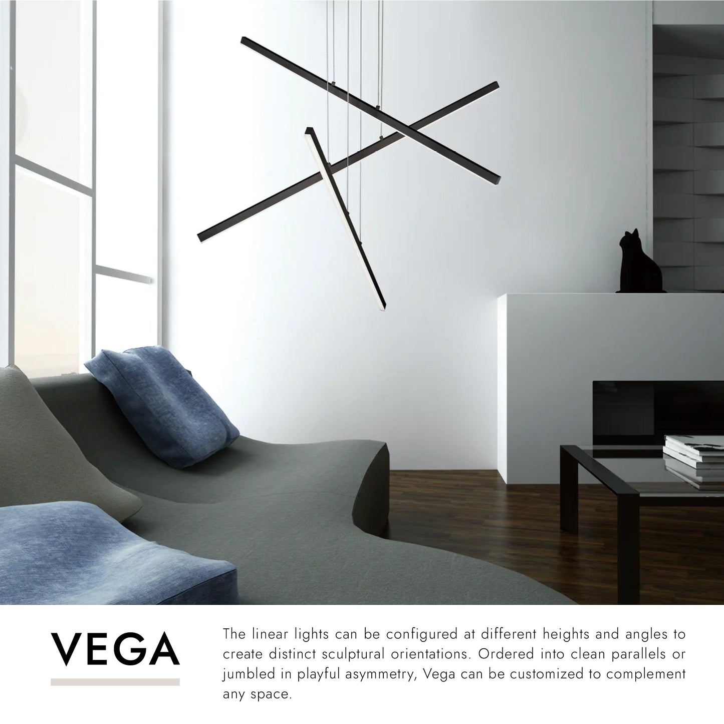The linear lights can be configured at different heights and angles to create distinct sculptural orientations. Ordered into clean parallels or jumbled in playful asymmetry, Vega can be customized to complement any space.