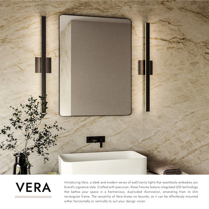 Introducing Vera, a sleek and modern series of wall/vanity lights that seamlessly embodies our brand's signature style. Crafted with precision, these fixtures feature integrated LED technology that bathes your space in a harmonious, dual-sided illumination, emanating from its slim rectangular frame. The versatility of Vera knows no bounds, as it can be effortlessly mounted either horizontally or vertically to suit your design vision.