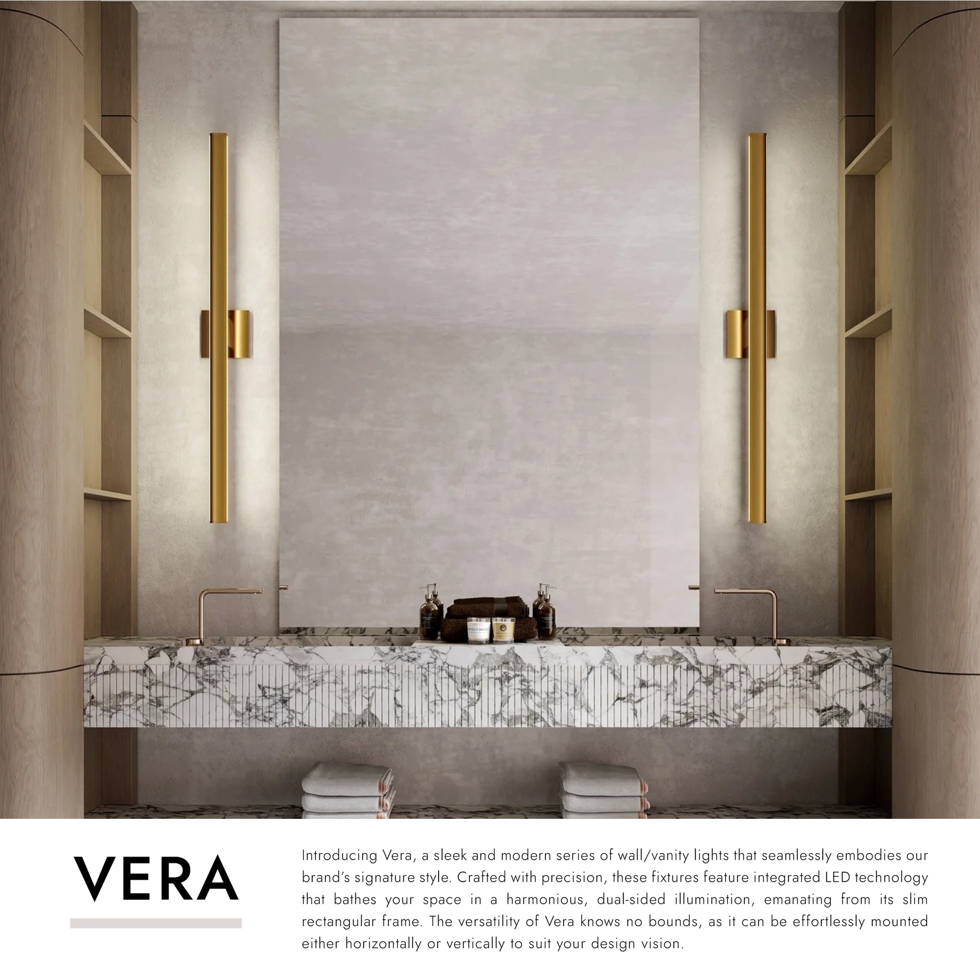 Introducing Vera, a sleek and modern series of wall/vanity lights that seamlessly embodies our brand's signature style. Crafted with precision, these fixtures feature integrated LED technology that bathes your space in a harmonious, dual-sided illumination, emanating from its slim rectangular frame. The versatility of Vera knows no bounds, as it can be effortlessly mounted either horizontally or vertically to suit your design vision.