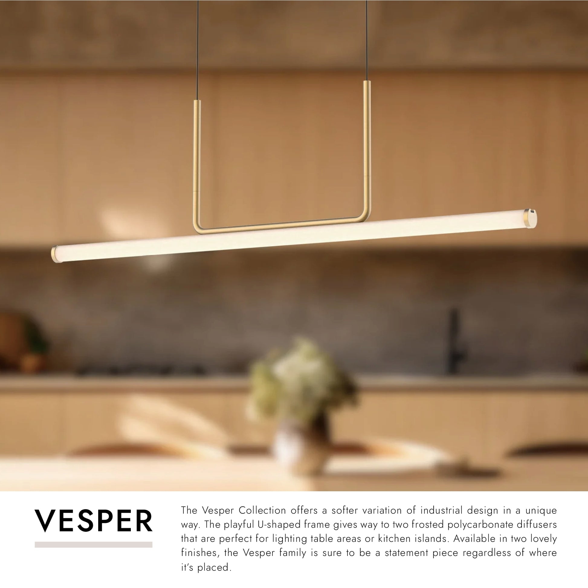 The Vesper Collection offers a softer variation of industrial design in a unique way. The playful U-shaped frame gives way to two frosted polycarbonate diffusers that are perfect for lighting table areas or kitchen islands. Available in two lovely finishes, the Vesper family is sure to be a statement piece regardless of where it's placed.