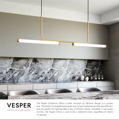 The Vesper Collection offers a softer variation of industrial design in a unique way. The playful U-shaped frame gives way to two frosted polycarbonate diffusers that are perfect for lighting table areas or kitchen islands. Available in two lovely finishes, the Vesper family is sure to be a statement piece regardless of where it's placed.