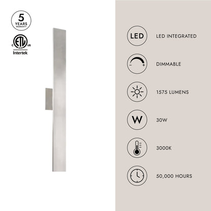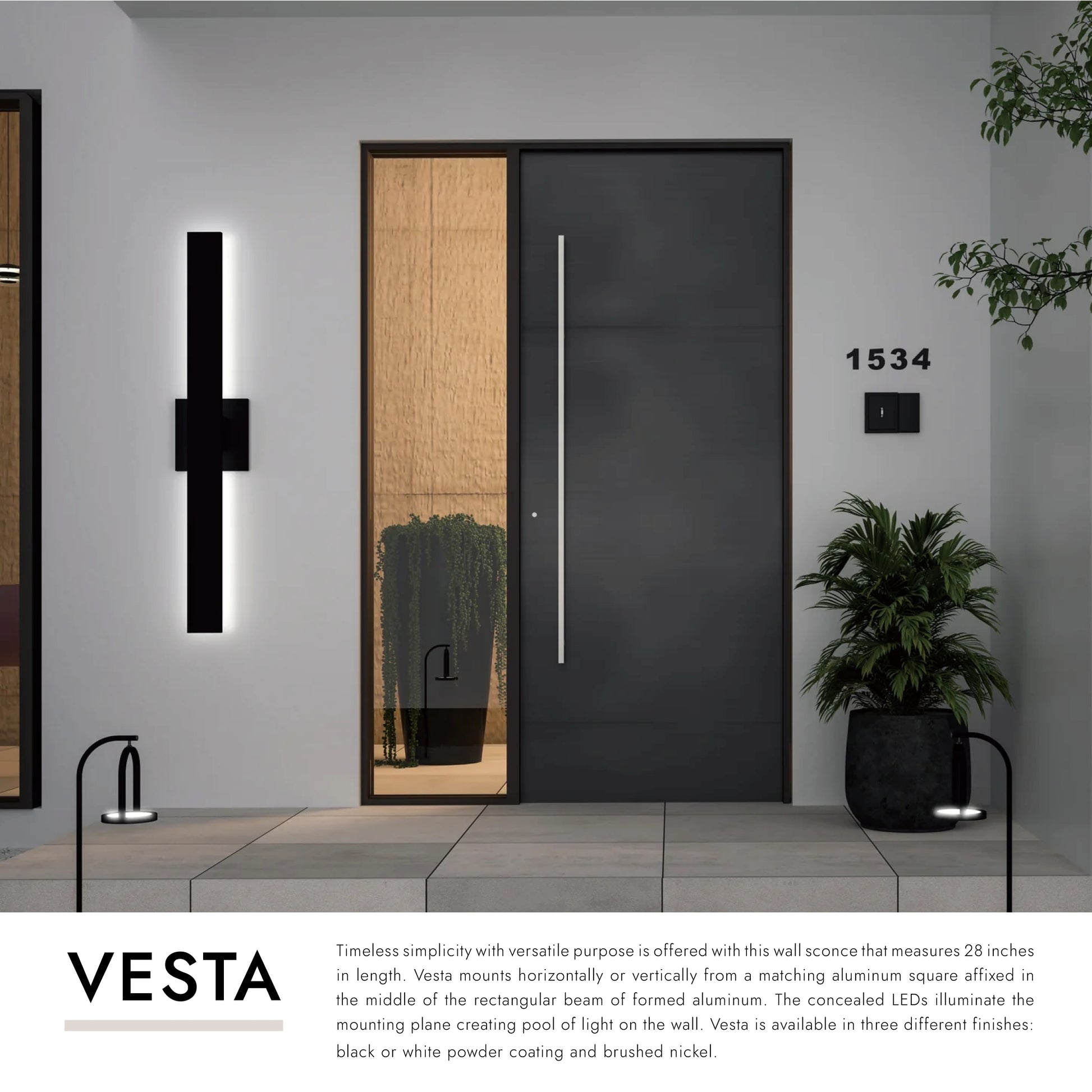 Timeless simplicity with versatile purpose is offered with this wall sconce that measures 28 inches in length. Vesta mounts horizontally or vertically from a matching aluminum square affixed in the middle of the rectangular beam of formed aluminum. The concealed LEDs illuminate the mounting plane creating pool of light on the wall. Vesta is available in three different finishes: black or white powder coating and brushed nickel.