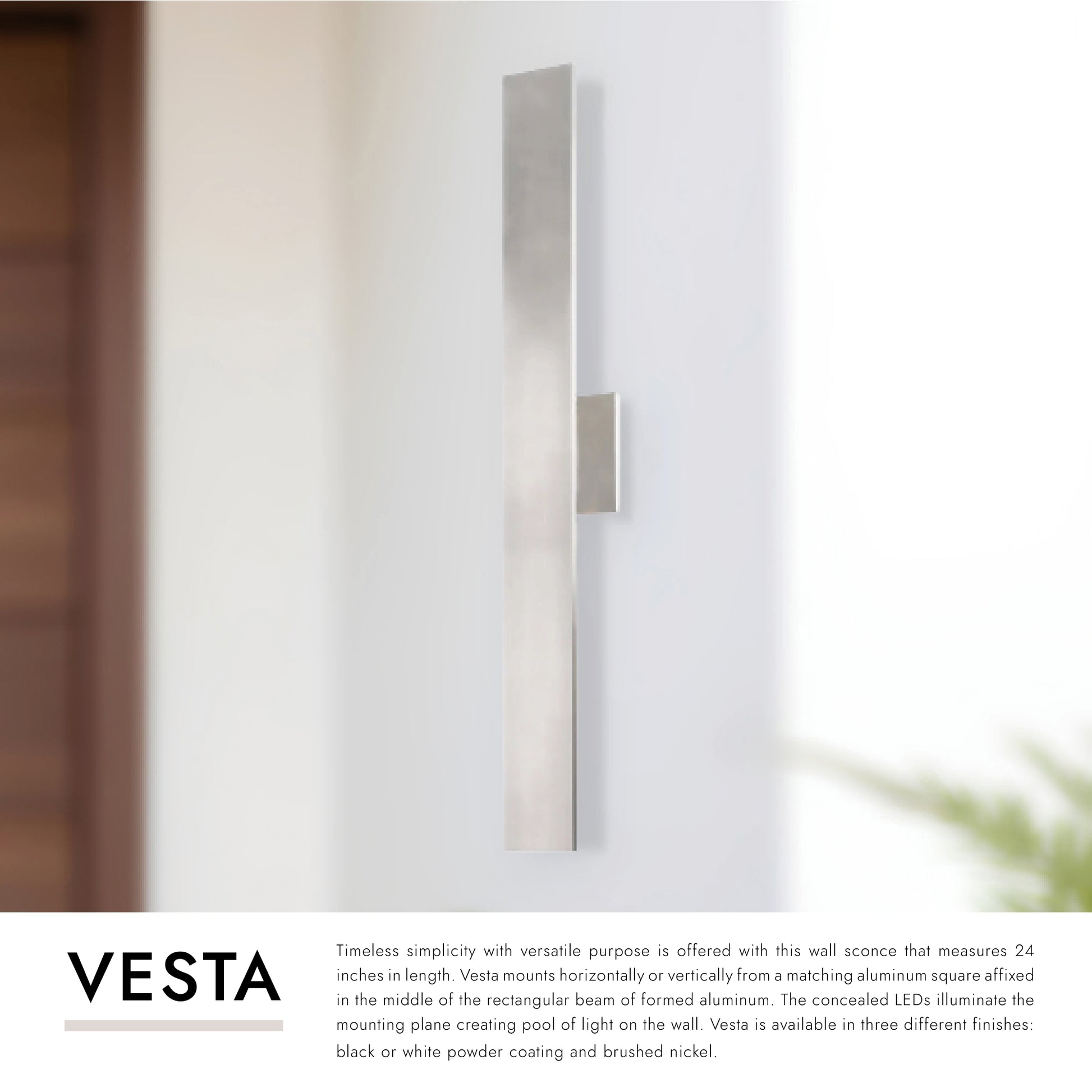 Timeless simplicity with versatile purpose is offered with this wall sconce that measures 35 inches in length. Vesta mounts horizontally or vertically from a matching aluminum square affixed in the middle of the rectangular beam of formed aluminum. The concealed LEDs illuminate the mounting plane creating pool of light on the wall. Vesta is available in three different finishes: black or white powder coating and brushed nickel.