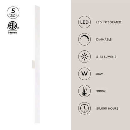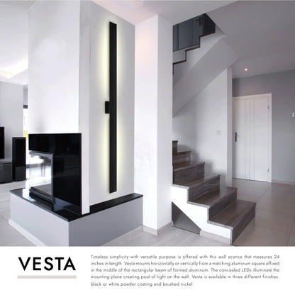 Timeless simplicity with versatile purpose is offered with this wall sconce that measures 72 inches in length. Vesta mounts horizontally or vertically from a matching aluminum square affixed in the middle of the rectangular beam of formed aluminum. The concealed LEDs illuminate the mounting plane creating pool of light on the wall. Vesta is available in three different finishes: black or white powder coating and brushed nickel.